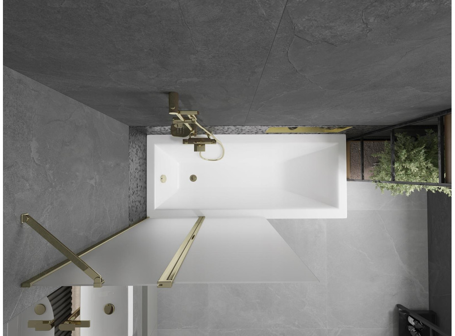 Dvoudílná vanová zástěna je vyrobena z 6 mm tlustého tvrzeného skla, které je zasazeno do hliníkových profilů se zlatou povrchovou úpravou. Zástěna se uchycuje pomocí hliníkového profilu do zdi s podpůrným ramenem, které zajišťuje extra stabilitu. Přístěnný profil umožňuje regulaci pro vyrovnání případných nerovností stěn. Pomocí otočného kloubu mezi skly můžete zástěnu snadno otevřít na obě strany.