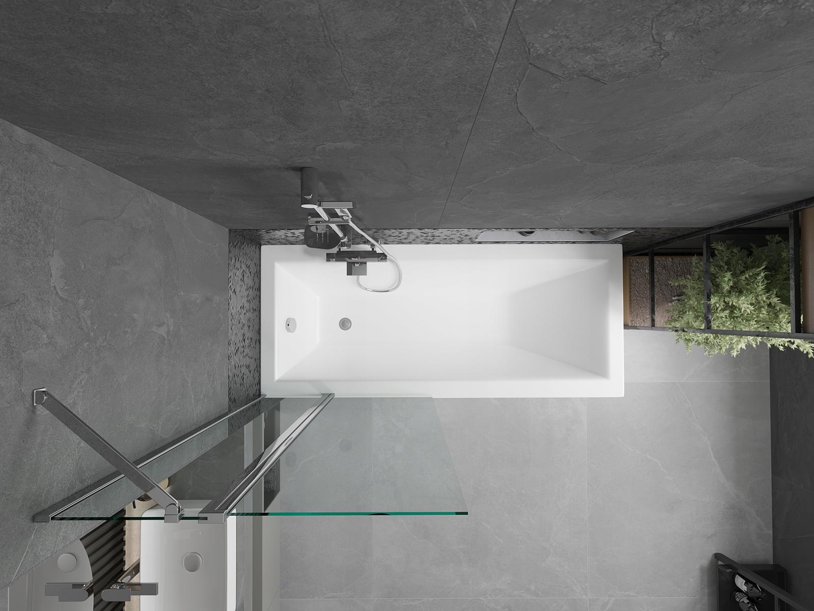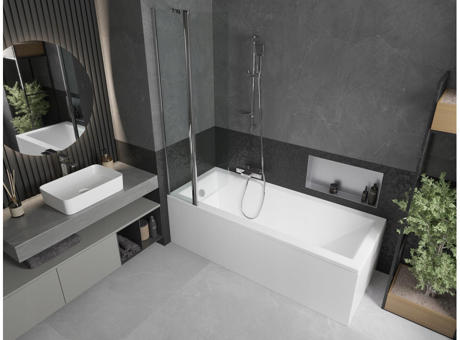 Dvoudílná vanová zástěna je vyrobena z 6 mm tlustého tvrzeného skla, které je zasazeno do hliníkových profilů s chromovou povrchovou úpravou. Zástěna se uchycuje pomocí hliníkového profilu do zdi s podpůrným ramenem, které zajišťuje extra stabilitu. Přístěnný profil umožňuje regulaci pro vyrovnání případných nerovností stěn. Pomocí otočného kloubu mezi skly můžete zástěnu snadno otevřít na obě strany.