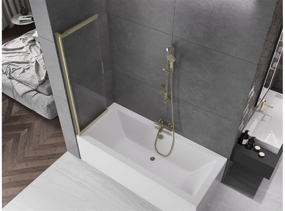 Dvoudílná vanová zástěna je vyrobena z 5 mm tlustého tvrzeného skla, které je zasazeno do hliníkových profilů se zlatou lesklou povrchovou úpravou. Zástěna se uchycuje pomocí hliníkového profilu do zdi. Přístěnný profil umožňuje regulaci pro vyrovnání případných nerovností stěn. Pomocí otočného kloubu u zdi můžete zástěnu snadno sklopit na zeď. Integrovaný posuvný mechanismus poté umožňuje vysunutí dveřní části a tím rozšíření zástěny.