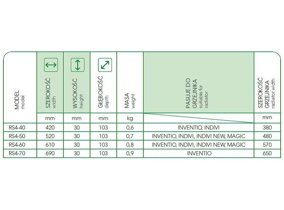 Věšák na ručníky RS4 je určený pro radiátor INDIVI a INVENTIO. Tyto praktické věšáky na radiátory zvyšují komfort používání koupelnového radiátoru. Rozměry věšáků jsou 420 mm, 520 mm, 610 mm a 690 mm, výška 30 mm, a jsou dostupné v bílé barvě. Radiátory nemají klasické žebrování, tak je pro sušení ručníků nutné použít tento praktický věšák na ručníky.