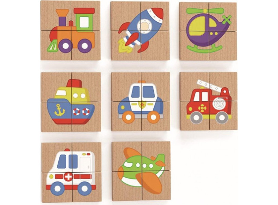 Osm skládaček s dopravními prostředky vyrobených z vysoce kvalitního dřeva. 32 čtverečků je opatřeno magnetickou vrstvou, která umožňuje skládání a následné hraní na lednici, magnetické tabuli či jiném kovovém povrchu. Součástí výrobku je i látkový pytlík. Skládáním puzzle si děti procvičují logiku, představivost, koordinaci oko - ruka.