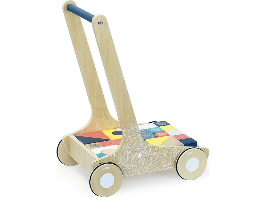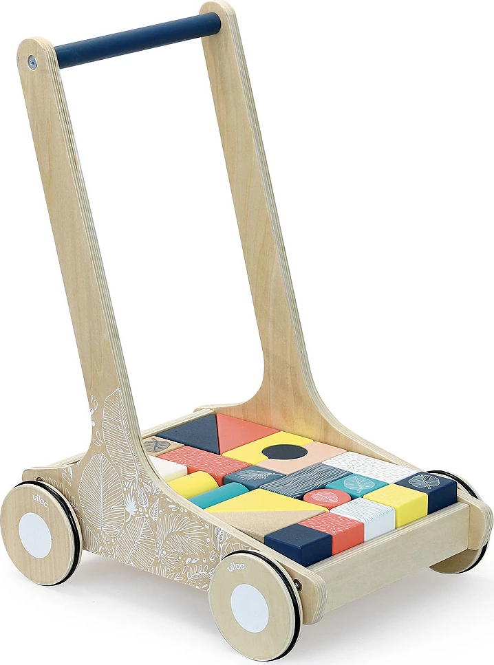 Dřevěný vozík s modrým madlem, bílou ilustrací a pogumovanými kolečky veze 24 kostek barevných i přírodních v různých tvarech. Děti podpoří při chůzi, hra s kostkami zase rozvine jejich prostorovou představivost. Vhodné od 12 měsíců.