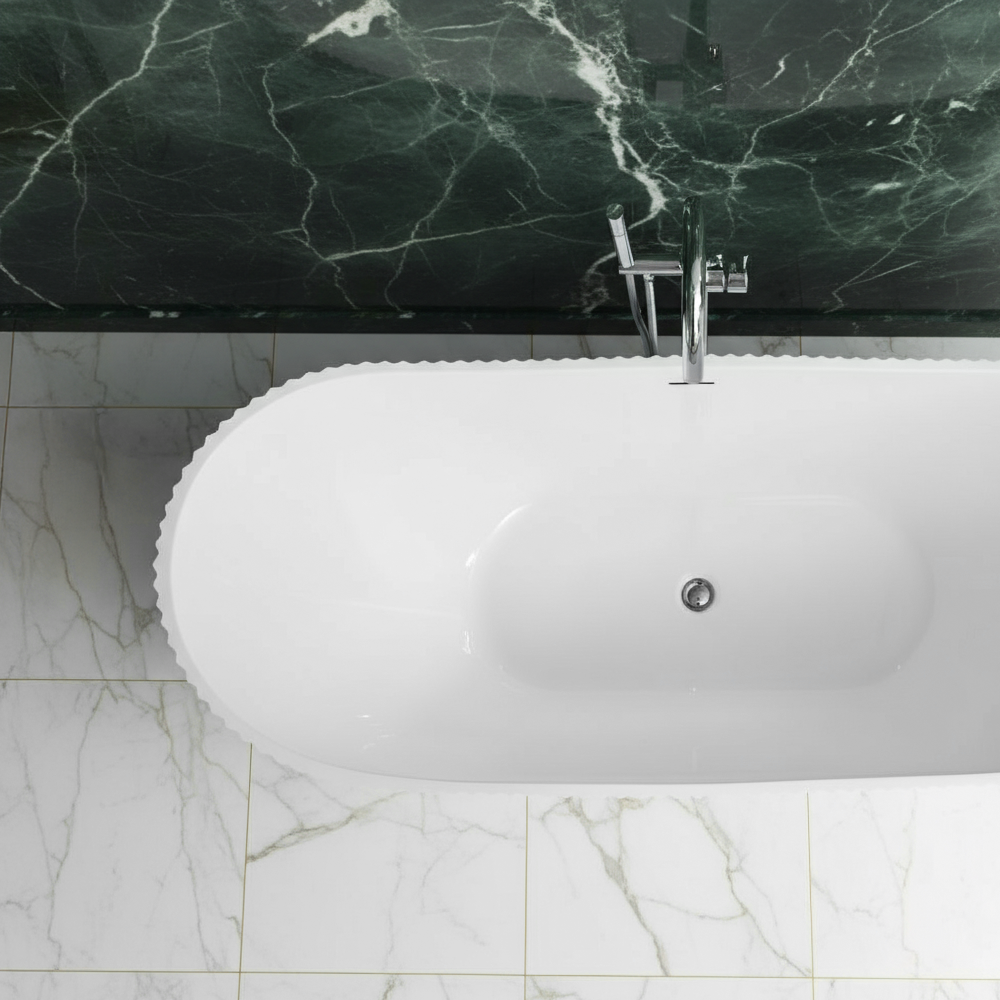 Luxusní oválná volně stojící akrylátová vana se stane nepřehlédnutelnou dominantou všech koupelen. Snadno ji umístíte ke zdi nebo kamkoliv do prostoru koupelny. Díky použitému kvalitnímu akrylátu a výrobním procesům obsahující několikanásobné leštění je vana nejen velmi robustní, pevná a odolná proti mechanickému poškození i poškrábání, ale také velmi hladká jak pohledově, tak i dotekem.