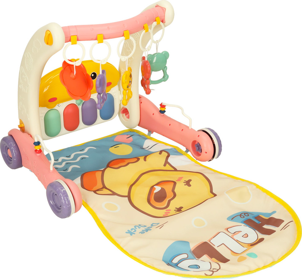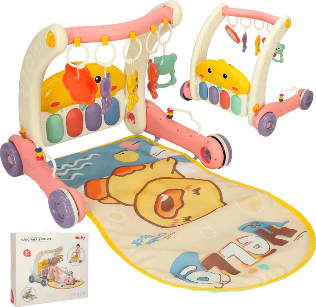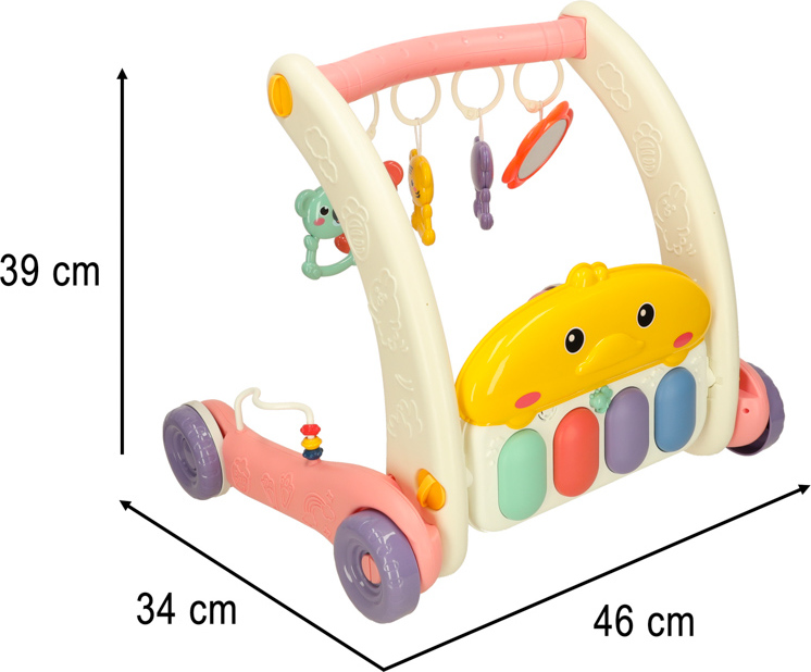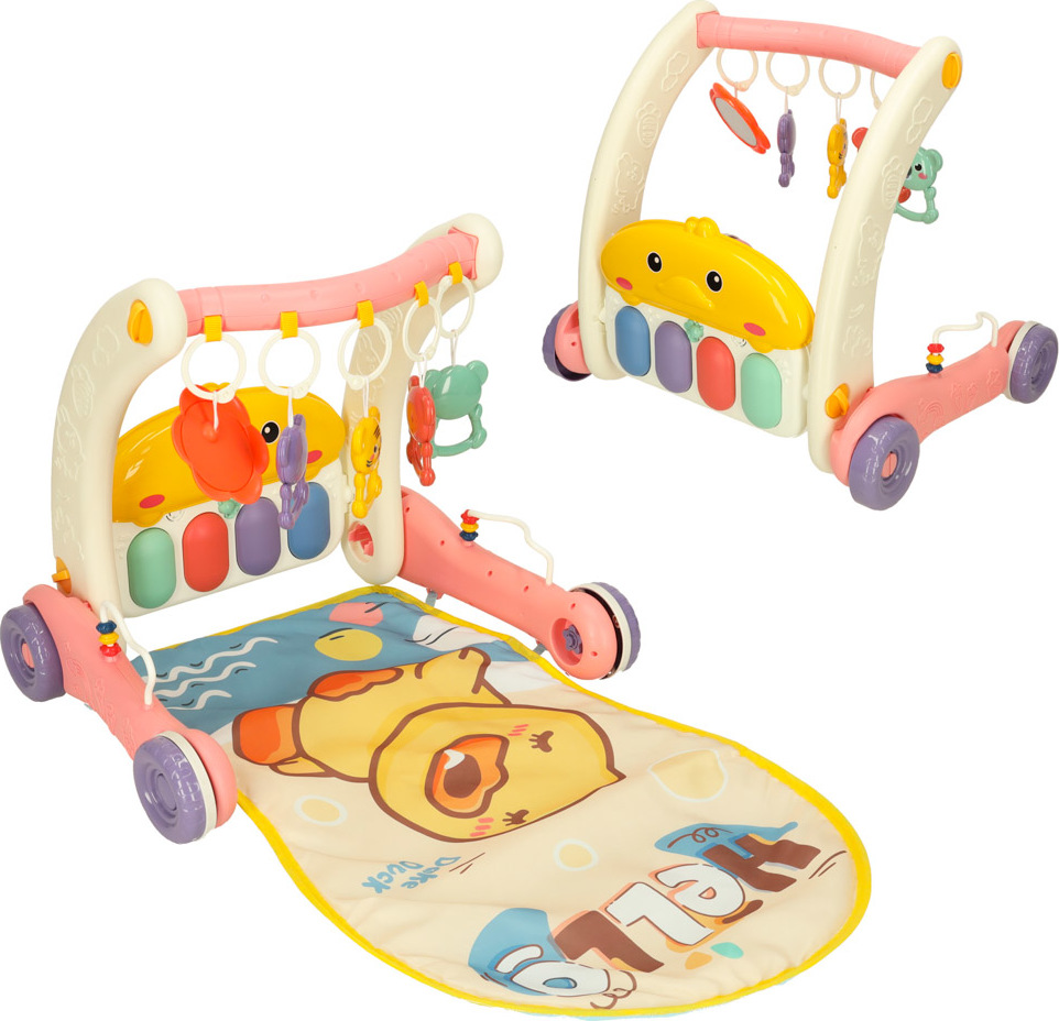 Jedná se o jedinečné zábavní centrum pro vaše dítě. Kombinuje funkce hrací podložky a stabilního chodítka, které podporuje první krůčky vašeho dítěte. Výrobek roste spolu s vaším dítětem. Na začátku, když dítě leží na bříšku, si může hrát s barevnými přívěsky a poslouchat zvuky klavíru. Až přijde čas na první krůčky, jednoduše přeměňte podložku na stabilní chodítko, které zajistí bezpečí a jistotu při učení chůze. Pianinko se dvěma provozními režimy a ovládáním hlasitosti zabaví na dlouhé hodiny. Příjemné melodie a zvuky stimulují smysly dítěte a rozvíjejí jeho sluch. Barevné přívěsky stimulují hmat a zrak a rozvíjejí koordinaci ruka-oko. Růžové chodítko podporuje motorický, kognitivní a smyslový vývoj dítěte. Pravidelnou hrou si batole procvičuje motorickou koordinaci a rozvíjí svou zvídavost vůči světu.