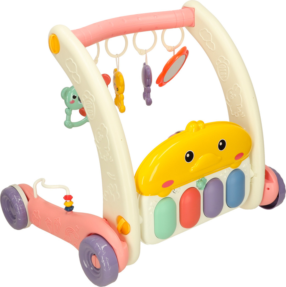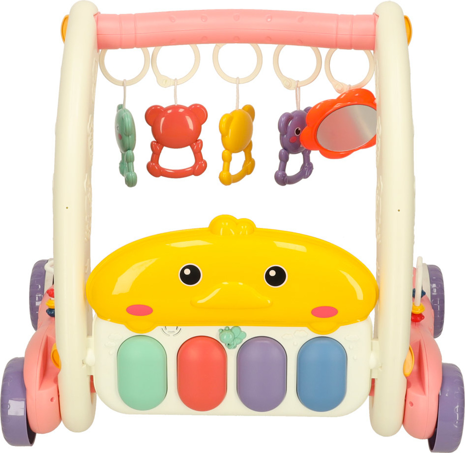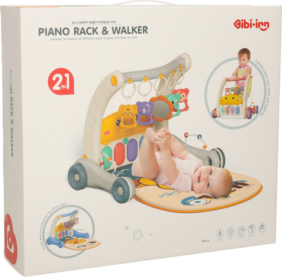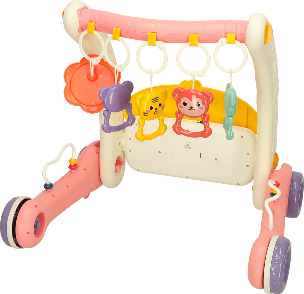 Jedná se o jedinečné zábavní centrum pro vaše dítě. Kombinuje funkce hrací podložky a stabilního chodítka, které podporuje první krůčky vašeho dítěte. Výrobek roste spolu s vaším dítětem. Na začátku, když dítě leží na bříšku, si může hrát s barevnými přívěsky a poslouchat zvuky klavíru. Až přijde čas na první krůčky, jednoduše přeměňte podložku na stabilní chodítko, které zajistí bezpečí a jistotu při učení chůze. Pianinko se dvěma provozními režimy a ovládáním hlasitosti zabaví na dlouhé hodiny. Příjemné melodie a zvuky stimulují smysly dítěte a rozvíjejí jeho sluch. Barevné přívěsky stimulují hmat a zrak a rozvíjejí koordinaci ruka-oko. Růžové chodítko podporuje motorický, kognitivní a smyslový vývoj dítěte. Pravidelnou hrou si batole procvičuje motorickou koordinaci a rozvíjí svou zvídavost vůči světu.