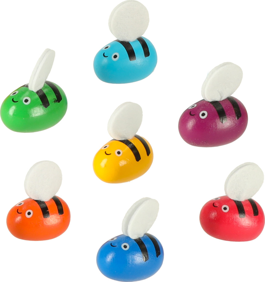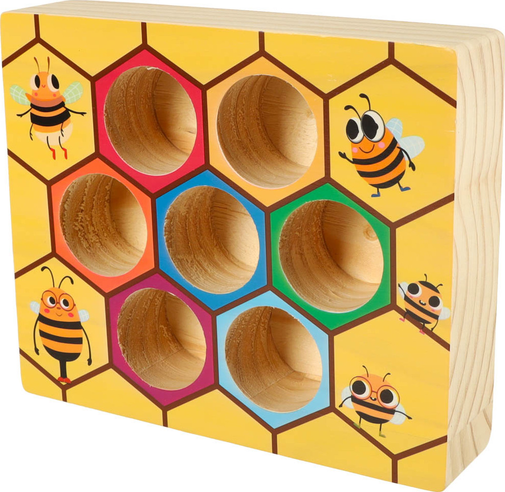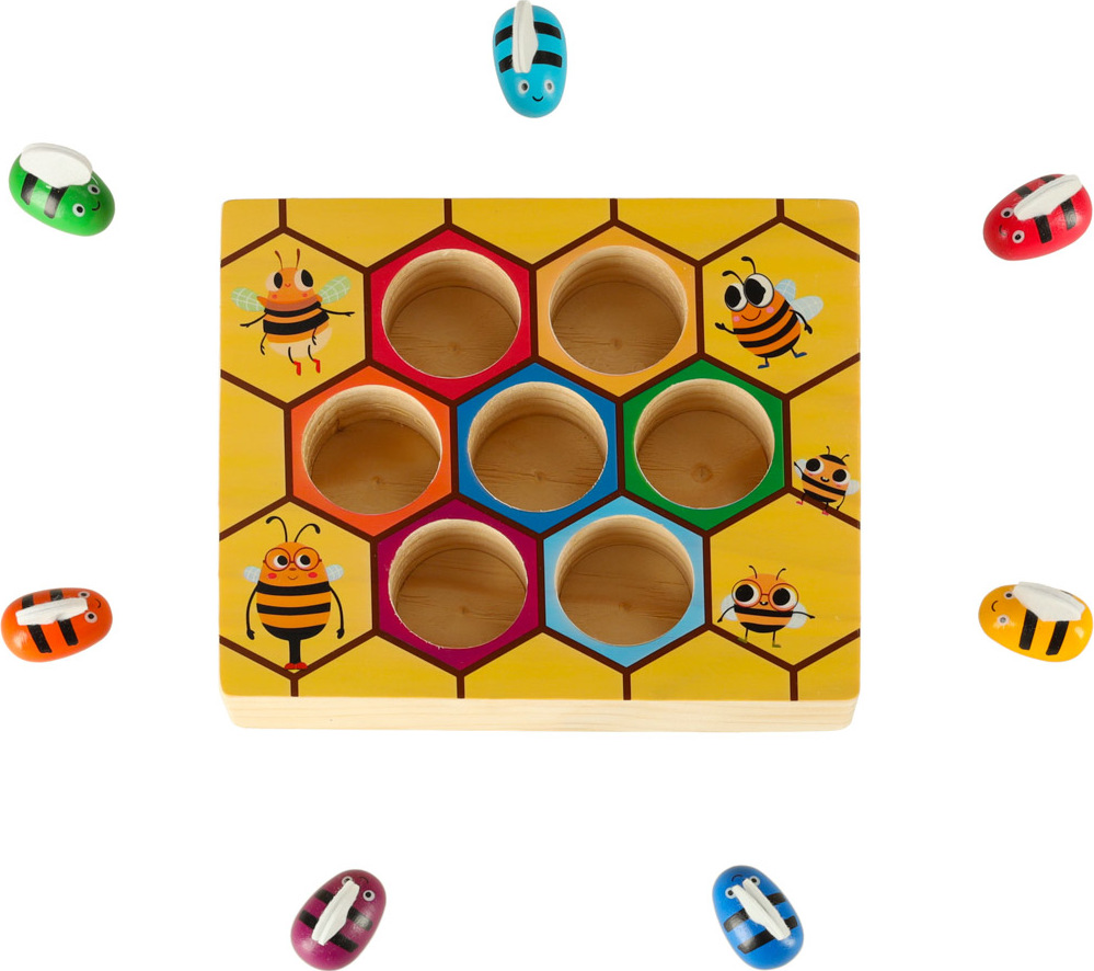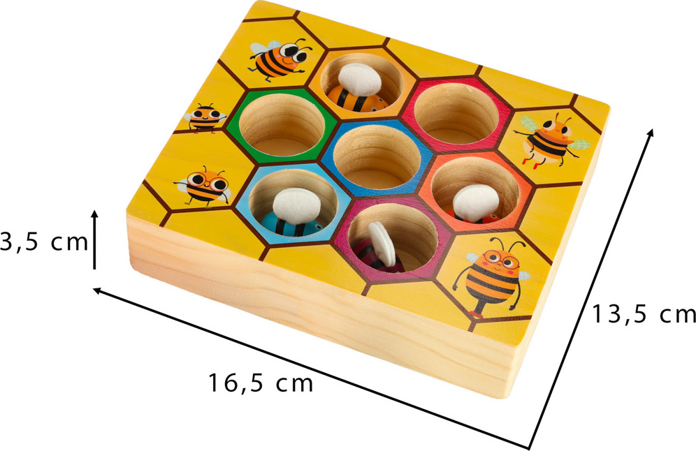 Obsahuje 7 včel - každou v jiné barvě a desku/podstavec z masivního dřeva. Na podstavci je zábavný obrázek s motivem včelí plástve. Dřevěné včelky mají křídla z materiálu podobného plsti, který svou odlišnou strukturou navíc stimuluje hmat malých dětí. Úkolem dítěte je vyjmout barevné včelky pomocí přiložené pinzety a poté každou včelku umístit do otvoru odpovídajícího její barvě.