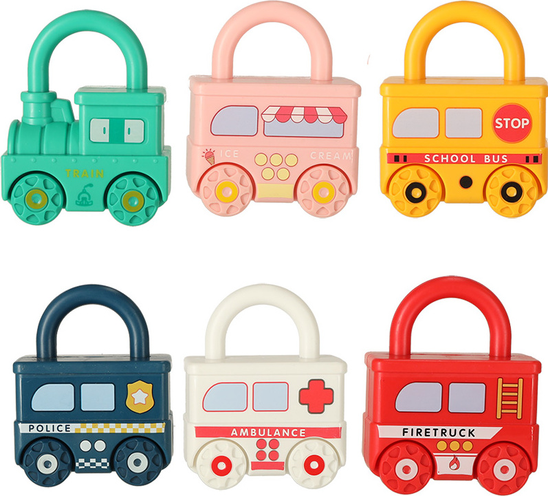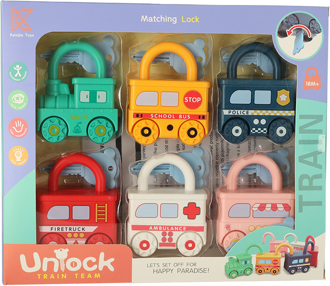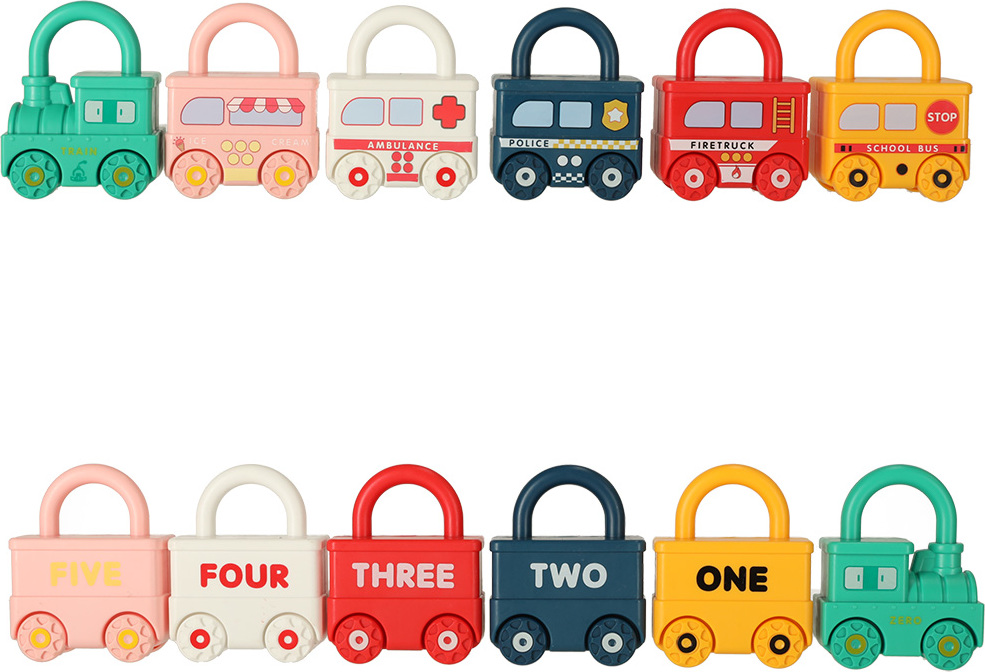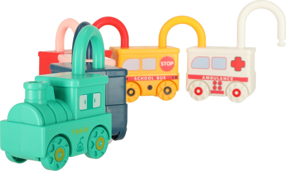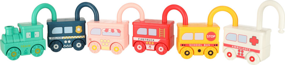 Je možné spojit hru s učením? Samozřejmě, že ano! A tato hračka je toho příkladem! Až šest rozkošných autíček na visací zámek: lokomotiva, školní autobus, policejní auto, hasiči, sanitka a zmrzlinář, které poskytují mnoho možností ke hře! Každé autíčko je v jiné barvě, takže se batole může naučit rozlišovat a pojmenovávat základní barvy. Autíčka jsou navíc oboustranná - na jedné straně mají grafiku znázorňující dané vozidlo a na druhé straně nápis. Nápisy na logách jsou v angličtině, ale nemusíte se bát, i když vaše děťátko nezná anglické názvy nebo neumí číst, tato hračka stále splní svůj účel. Na každém autíčku jsou kolečka, která může vaše dítě počítat, a tak přiřadit příslušný klíč k číslu. Batole může také přiřadit klíče k visacím zámkům metodou pokusu a omylu. Sada visacích zámků bude pro dítě vynikající výzvou. Pomocí nápověd na autíčkách a na klíčích bude muset batole přiřadit jednotlivé dílky tak, aby se visací zámky otevřely. Sada obsahuje také jeden kouzelný klíč, který otevře všechny visací zámky! Po otevření visacích zámků lze autíčka spojit a vytvořit vlak libovolné kombinace. A pak se vydejte na barevnou cestu vláčkem po místnosti! Otevírání visacích zámků, otáčení klíčů, kombinování vozidel a hra na průvodčí budou skvělým způsobem, jak rozvíjet manuální dovednosti a koordinaci očí a rukou.
