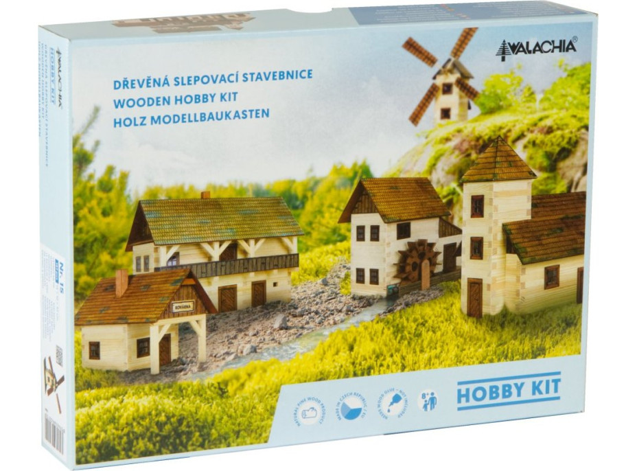 Ve stavebnicích HOBBY KITS naleznete vše potřebné k sestavení. Ke stavbě slouží jednoduché obrázkové návody se symboly jednotlivých úkonů, a proto je můžou sestavovat děti po celém světě. Základním stavebním materiálem jsou přesně zhotovené hranoly z borového dřeva a rozměru 9×9 mm v délkách od 16 do 230 mm určených ke stavbě roubených stěn. Plochy střech, štítů, pavlačí a teras jsou zhotoveny z překližky 3 mm a polepují se papírovými potisky. Funkční dveře a okna zasklená folií jsou z potisklého kartonu. Jednotlivé stavby se slepují lepidlem na dřevo a papír (není obsahem). Součástí návodu jsou malé kapitoly ze stavebního oboru a historie lidové architektury. Modely staveb jsou v měřítku 1:32.