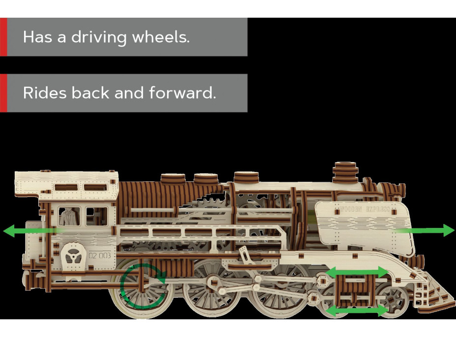 Od dětství každý snil o tom, že bude mít vláček s kolejemi, bude ho sestavovat a sledovat, jak jezdí. Dokonale navržený dřevěný Express s realistickými detaily vám pomůže vrátit se do minulosti a připomenout si své vzpomínky a pocity. Sestavte model s kamarády nebo dětmi, postavte ho na koleje a užijte si chvíle zábavy a štěstí v přítomnosti. - startuje se speciálním klíčem - dvířka od spalovny - hnací kola - spřáhlo spojující express a tendr - jezdí dopředu, dozadu a dokola - sestavený model: 35 x 11 x 12,2 cm - rozměry kolejí: 60 x 6,1 x 1,5 cm 3D puzzle WOODEN CITY Wooden Express je neobvyklým dárkem pro vaše blízké a milovníky světa na kolejích. Obtížnost: 4 z 5 (dle rozdělení Wooden City) Orientační doba na složení: 7 hodin Měřítko: 1:40 Dřevěné 3D puzzle WOODEN CITY jsou detailně propracované funkční mechanické modely, které se skládají bez lepidla nebo nářadí. Jsou vyrobeny z ekologických dřevěných materiálů - kvalitní březové překližky. S mechanickými dřevěnými puzzle WOODEN CITY zažijete hodiny zábavy při skládání a poznáte převody, gumičkové motory, ozubená kolečka a další součástky z bezprostřední blízkosti. funkční mechanický model skládání bez použití lepidla nebo nářadí kvalitní zpracování z přírodního materiálu propracované detaily obrázkový návod UPOZORNĚNÍ: K sestavení je třeba ulamovací nůž, nůžky, brusný papír a svíčku z vosku (není součástí výrobku). Pro správné fungování a bezproblémový provoz je potřeba nápravy a ozubená kolečka navoskovat. Rozměr složeného puzzle cca 35 x 11 x 12,2 cmVlastnosti