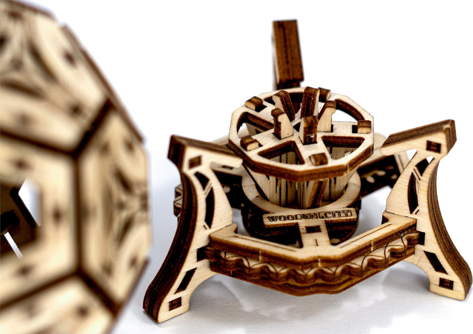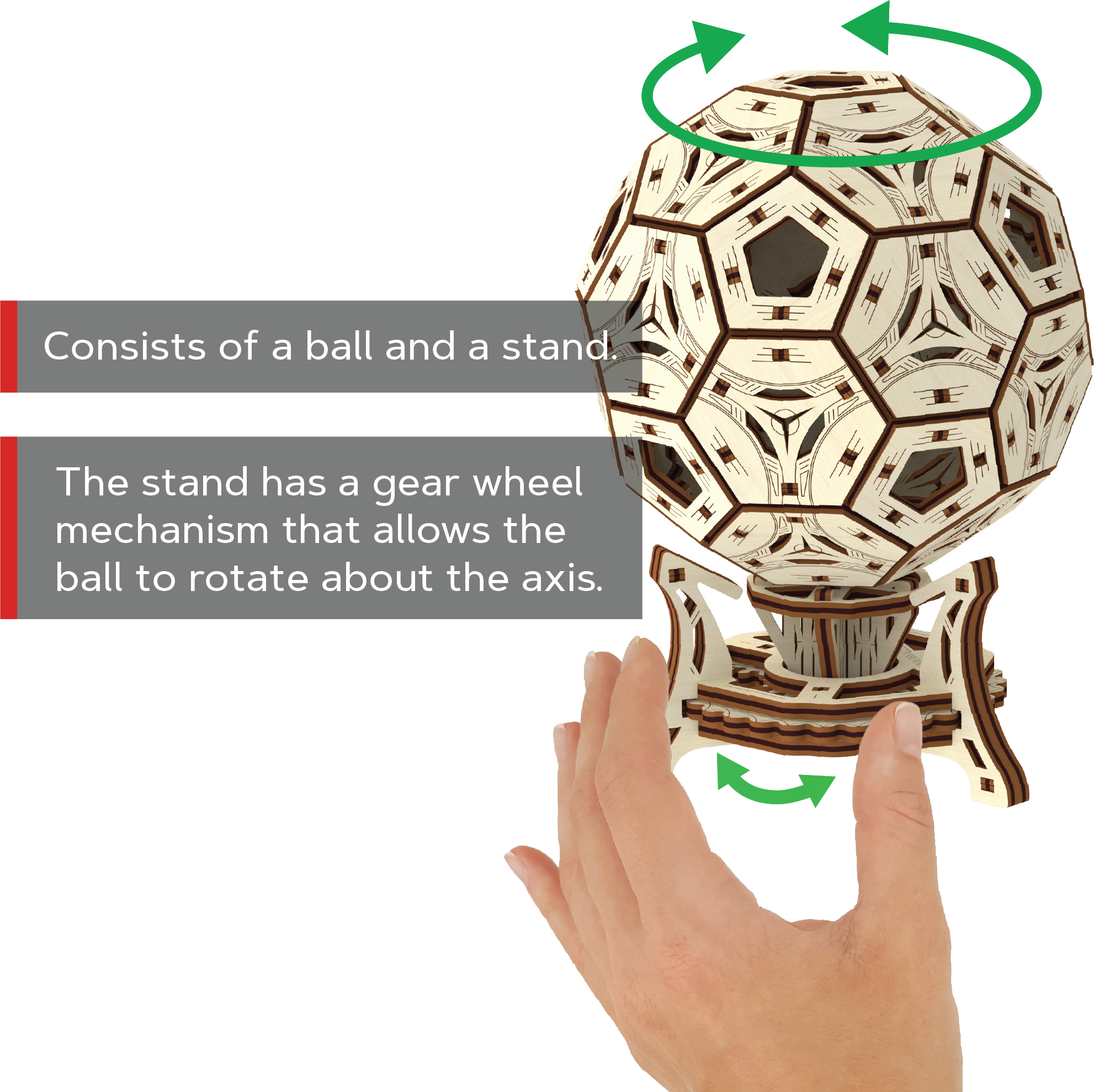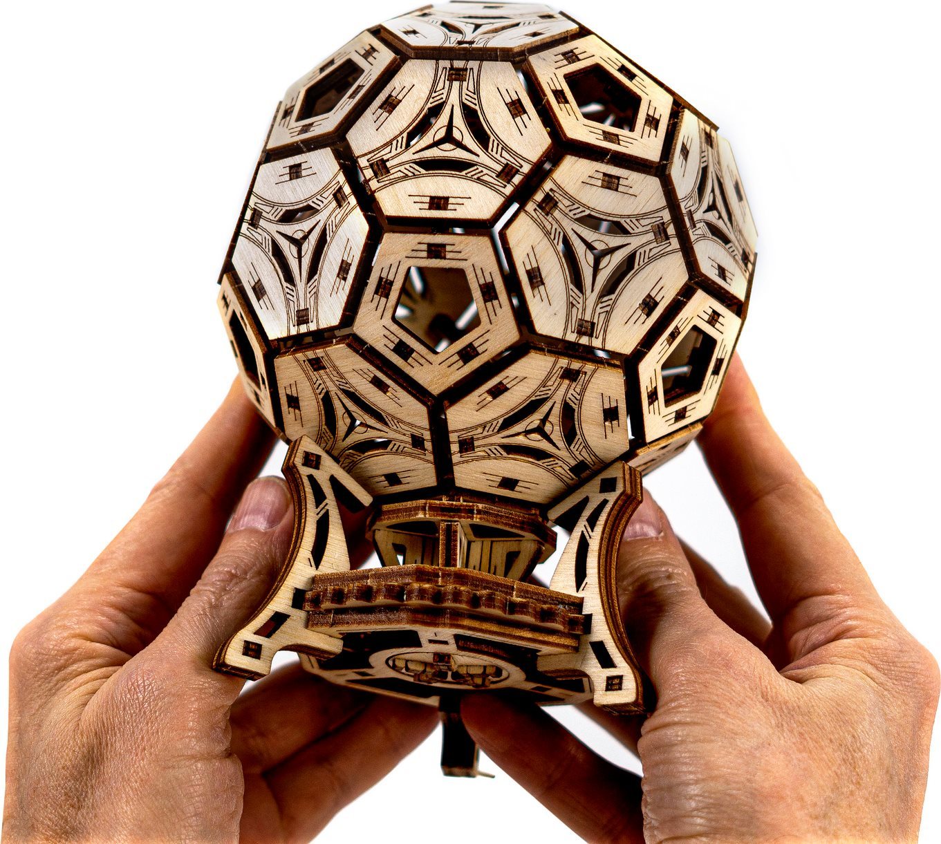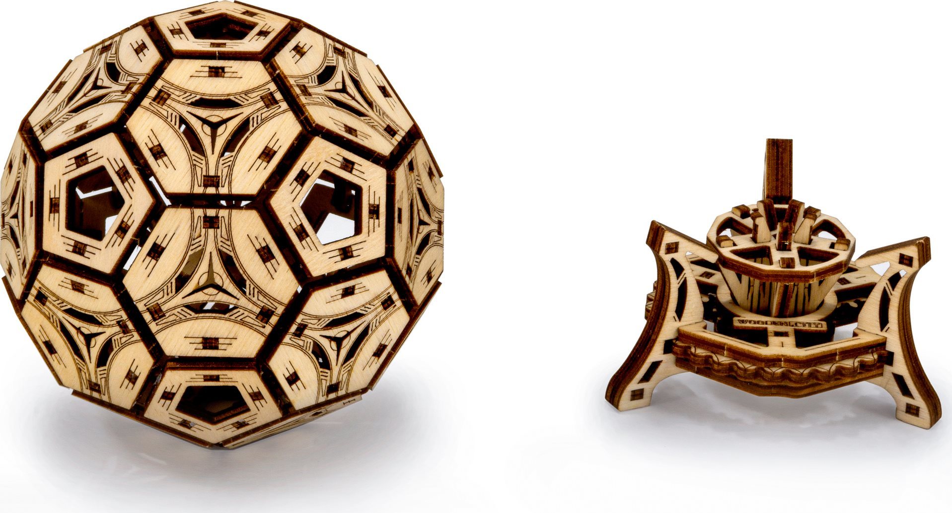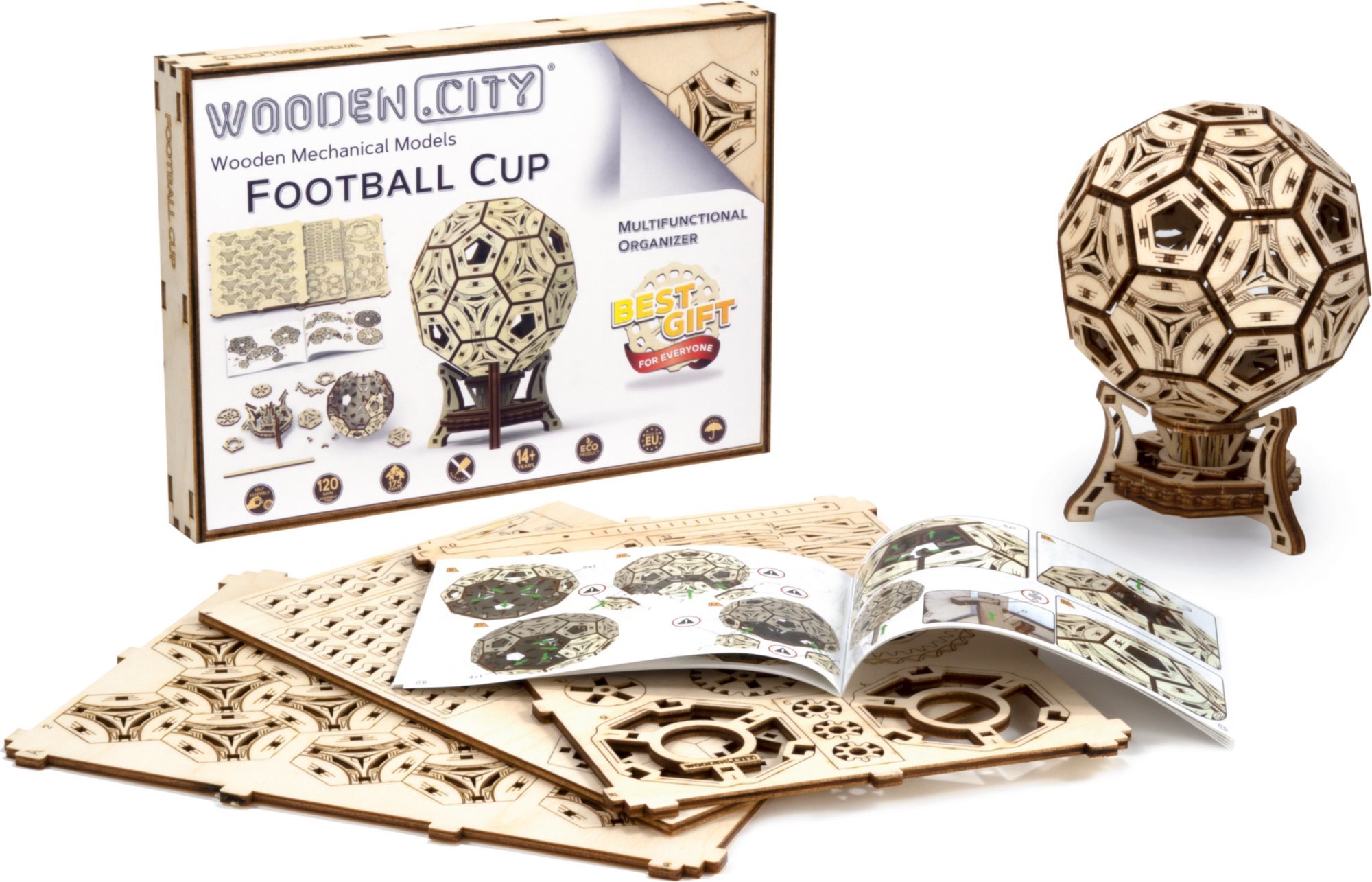 Proč je být fotbalistou tak cool? Především jste vždycky ve skvělé formě, sport je váš život, jste slavní, máte svalnaté nohy a spoustu obdivovatelek. Zní to skvěle? Tento multifunkční 3D organizér je stvořený právě pro vás - úžasný fotbalový pohár. - lze použít pro kancelářské věci - roztočte stojan a sledujte, jak se míč otáčí - vyjměte míč ze stojanu a hrajte si jen tak 3D puzzle WOODEN CITY Footbal Cup je skvělým dárkem pro všechny fotbalové nadšence a fanoušky. Obtížnost: 3 z 5 (dle rozdělení Wooden City) Orientační doba na složení: 2 hodiny Dřevěné 3D puzzle WOODEN CITY jsou detailně propracované funkční mechanické modely, které se skládají bez lepidla nebo nářadí. Jsou vyrobeny z ekologických dřevěných materiálů - kvalitní březové překližky. S mechanickými dřevěnými puzzle WOODEN CITY zažijete hodiny zábavy při skládání a poznáte převody, gumičkové motory, ozubená kolečka a další součástky z bezprostřední blízkosti. funkční mechanický model skládání bez použití lepidla nebo nářadí kvalitní zpracování z přírodního materiálu propracované detaily obrázkový návod UPOZORNĚNÍ: K sestavení je třeba ulamovací nůž, nůžky, brusný papír a svíčku z vosku (není součástí výrobku). Pro správné fungování a bezproblémový provoz je potřeba nápravy a ozubená kolečka navoskovat. Rozměr složeného puzzle cca 15,4 x 11,4 x 11,4 cmVlastnosti