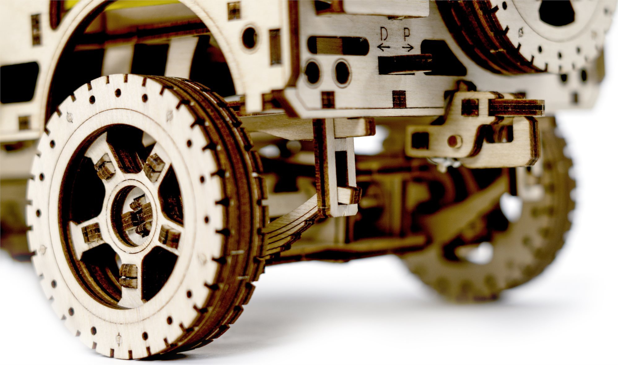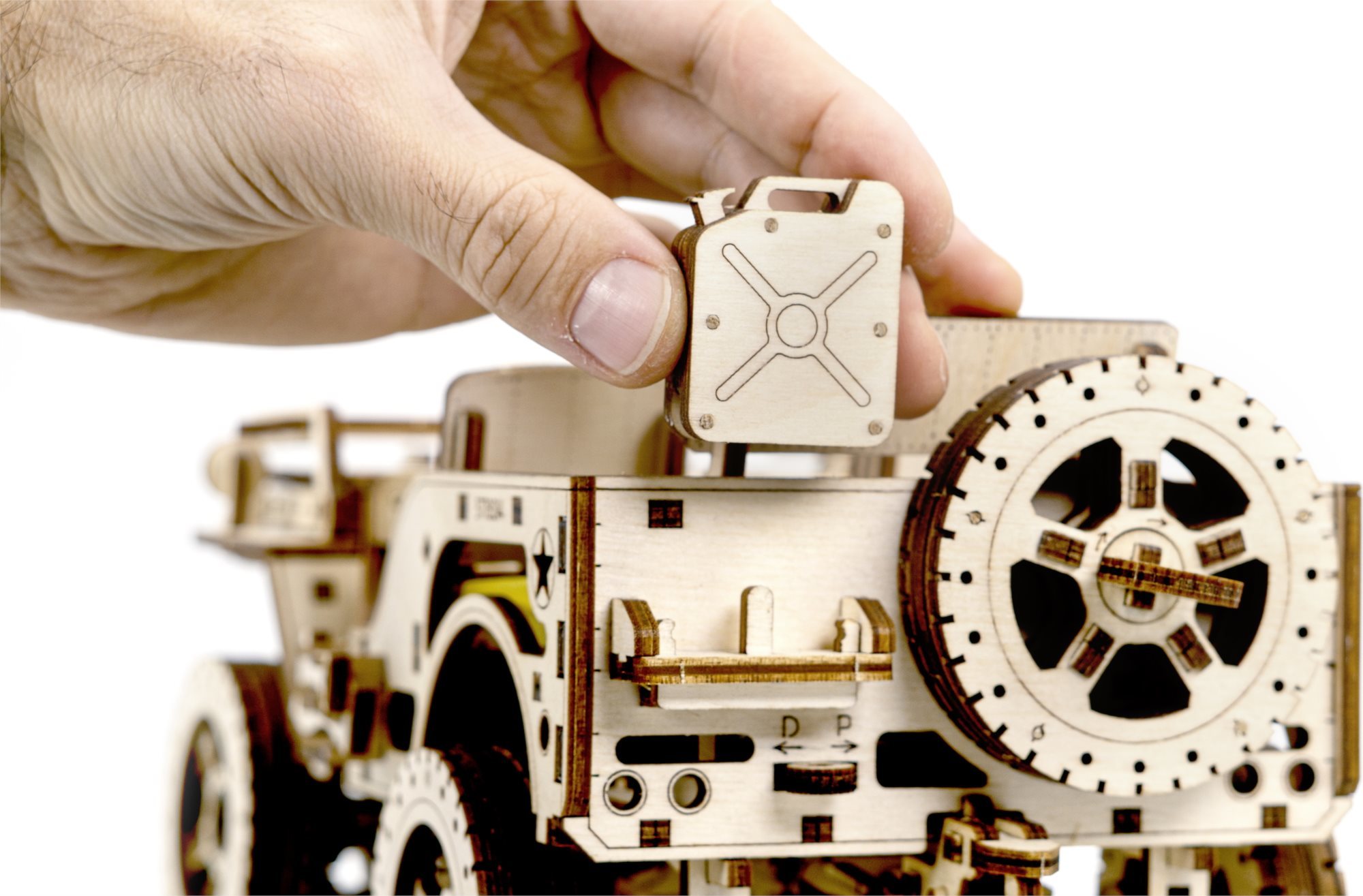 Naše 3D puzzle 4×4 slavného amerického terénního vozidla . Tento model je po sestavení složitým mechanismem s jemnými detaily. Je to předchůdce dnešních SUV, vozidlo s mužným charakterem! Během druhé světové války zahájila americká automobilka Willys-Overland Motors výrobu svého legendárního armádního džípu Willys MB. V roce 1941 byla zahájena sériová výroba tohoto vojenského užitkového vozidla, které bylo okamžitě ve velkém množství nasazeno spojeneckými silami. Do historie se zapsaly jako spolehlivé, obratné a funkční. Byl to skutečně "technický průlom" a skutečný "válečný motor". Dnes jsou džíp i jeho nástupce, SUV, drahá terénní vozidla určená pro odolné jedince. Překonávají překážky, prach, cesty a nebezpečí. Model s vlastnostmi skutečného vozidla: spalovací motor s pohyblivými písty a spouštěcí páku v zadní části vozidla, ráčnový mechanismus, páku pro přepínání směru pohybu, tři pohyblivé pedály (každý z nich je odpružený a má vlastní ovládání pomocí gumičky), závěs v zadní části modelu určený pro jeho přívěs, pohon všech kol a nezávislé zavěšení obou náprav, odnímatelná lopata, sekera a kanystr, zpětné zrcátko, hnací hřídel a poloosy s křížením, jaké najdete na skutečném džípu, jezdí do vzdálenosti až 2 m. Po sestavení nastavte polohu páky na jízdu vpřed nebo vzad, dejte zamykací páku do polohy stop, natočte model klíčkem (klíč najdete v rezervním kole) a poté spusťte zamykací páku. Džíp má řízení předních kol. Kapota se otevírá a zavírá a je zajištěna dvěma sponami a čelní sklo se vyklápí. 3D puzzle WOODEN CITY Model 4x4 je neobvyklým dárkem pro vaše blízké a milovníky silných vozů. Obtížnost: 5 z 5 (dle rozdělení Wooden City) Orientační doba na složení: 12 hodin Měřítko: 1:12 Dřevěné 3D puzzle WOODEN CITY jsou detailně propracované funkční mechanické modely, které se skládají bez lepidla nebo nářadí. Jsou vyrobeny z ekologických dřevěných materiálů - kvalitní březové překližky. S mechanickými dřevěnými puzzle WOODEN CITY zažijete hodiny zábavy při skládání a poznáte převody, gumičkové motory, ozubená kolečka a další součástky z bezprostřední blízkosti. funkční mechanický model skládání bez použití lepidla nebo nářadí kvalitní zpracování z přírodního materiálu propracované detaily obrázkový návod UPOZORNĚNÍ: K sestavení je třeba ulamovací nůž, nůžky, brusný papír a svíčku z vosku (není součástí výrobku). Pro správné fungování a bezproblémový provoz je potřeba nápravy a ozubená kolečka navoskovat. Rozměr složeného puzzle cca 27,9 x 15,1 x 14,8 cmVlastnosti