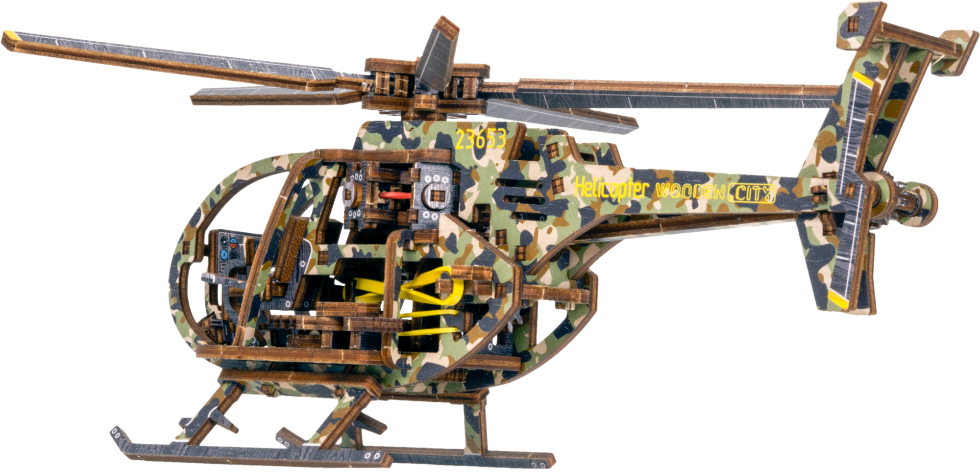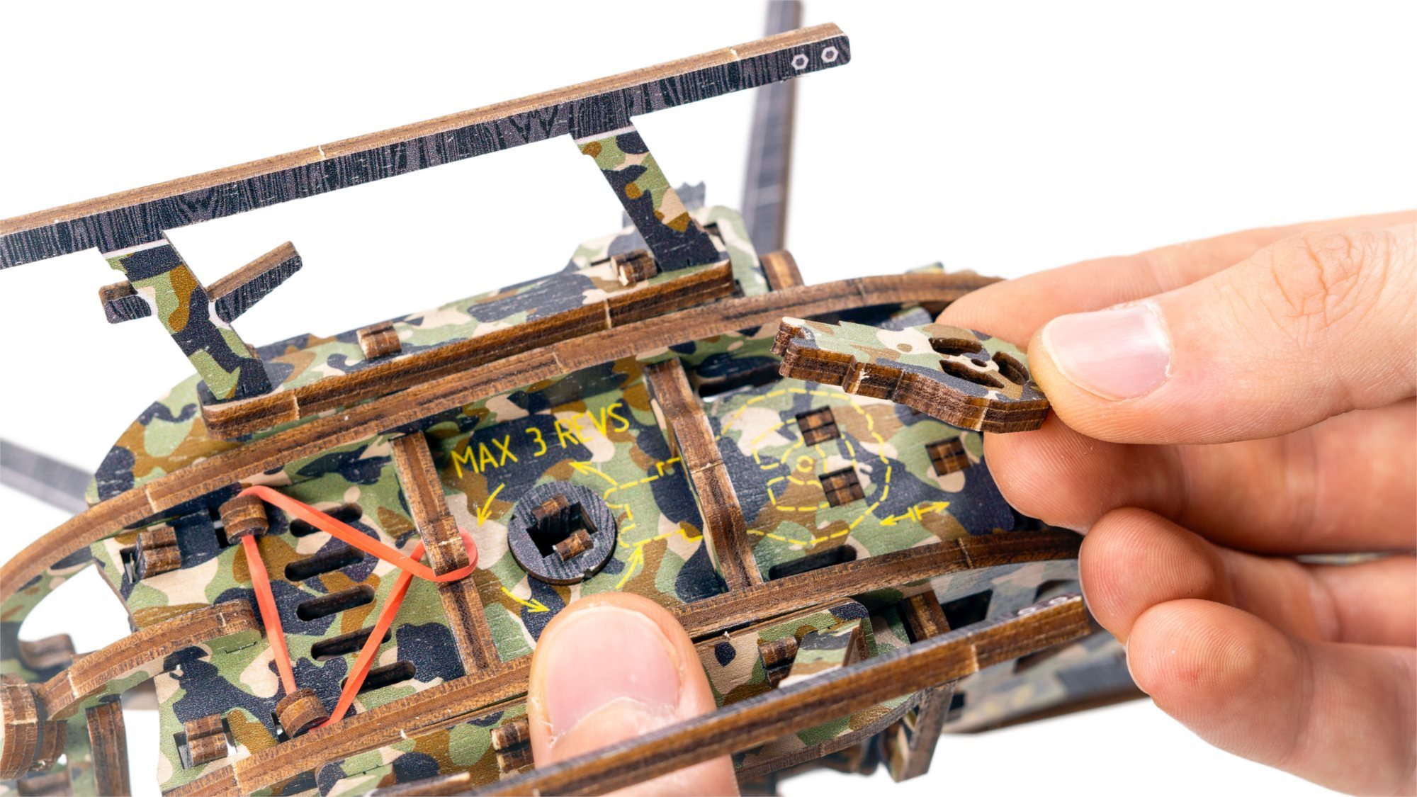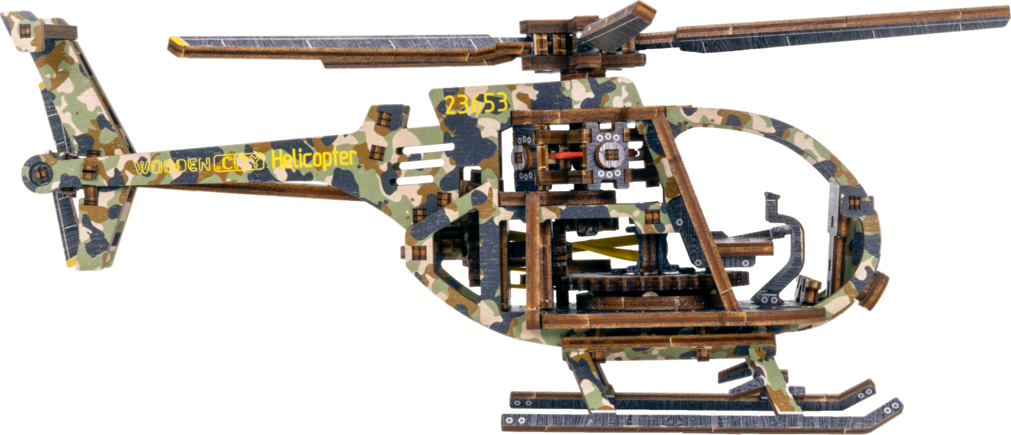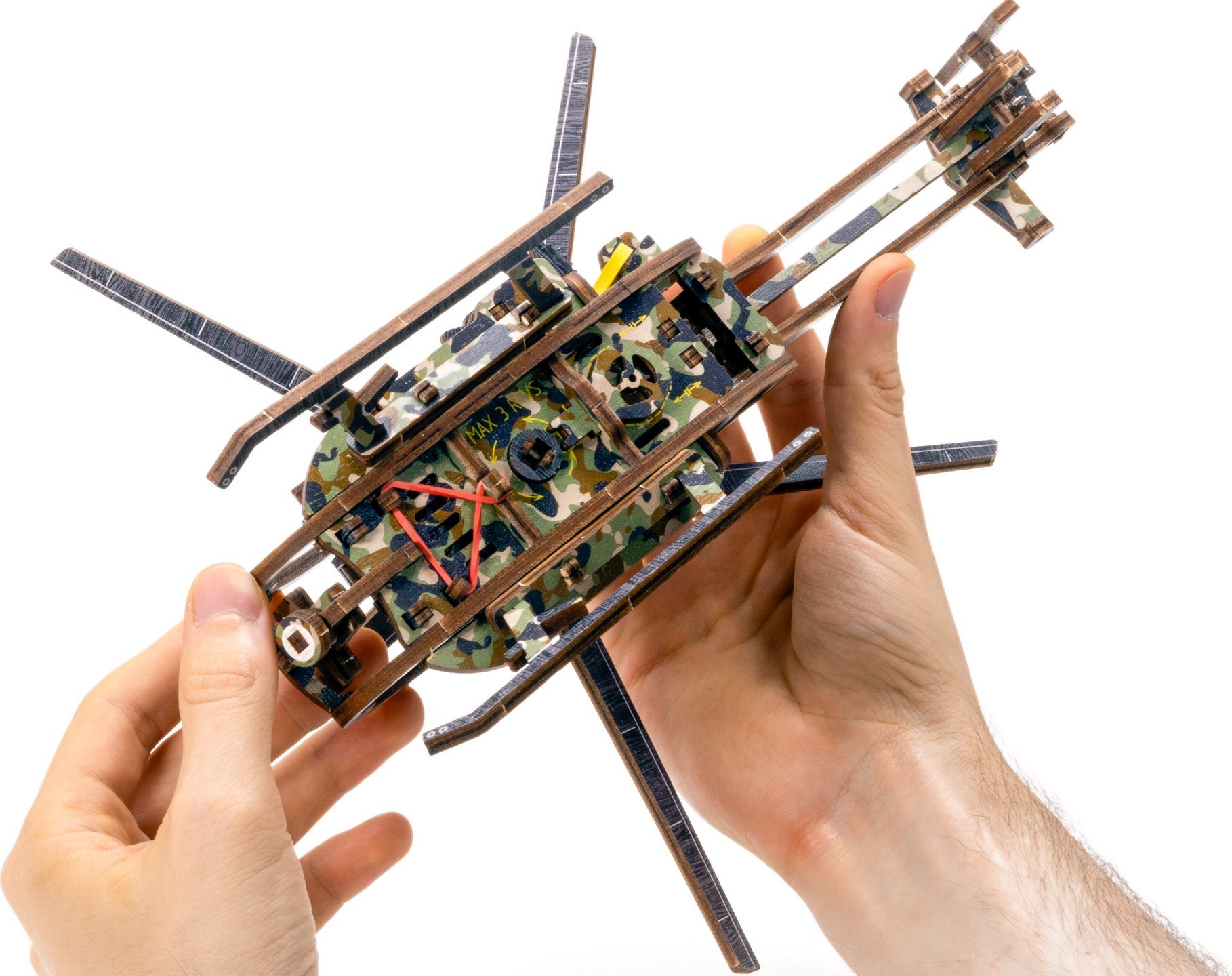 Dřevěná mechanická stavebnice vojenského vrtulníku na vás čeká! Díky jedinečnému designu a překvapivým detailům tohoto modelu bude vaše trávení času plné zábavy a skvělých emocí. Vlastnosti modelu: - výrazné barevné prvky díky vysoce přesnému UV tisku, - dřevěná krabička slouží jako podstavec, - sběratelská edice. 3D puzzle WOODEN CITY Helicopter bude nejlepším dárkem pro každého milovníka letectví. Obtížnost: střední 3 z 5 Orientační doba na složení: 4 hodiny Měřítko: 1:30 Dřevěné 3D puzzle WOODEN CITY jsou detailně propracované funkční mechanické modely, které se skládají bez lepidla nebo nářadí. Jsou vyrobeny z ekologických dřevěných materiálů - kvalitní březové překližky. S mechanickými dřevěnými puzzle WOODEN CITY zažijete hodiny zábavy při skládání a poznáte převody, gumičkové motory, ozubená kolečka a další součástky z bezprostřední blízkosti. funkční mechanický model skládání bez použití lepidla nebo nářadí kvalitní zpracování z přírodního materiálu propracované detaily UPOZORNĚNÍ: K sestavení je třeba ulamovací nůž, nůžky, brusný papír a svíčku z vosku (není součástí výrobku). Pro správné fungování a bezproblémový provoz je potřeba nápravy a ozubená kolečka navoskovat. Rozměr složeného puzzle cca 24 x 12 x 30,5 cmVlastnosti
