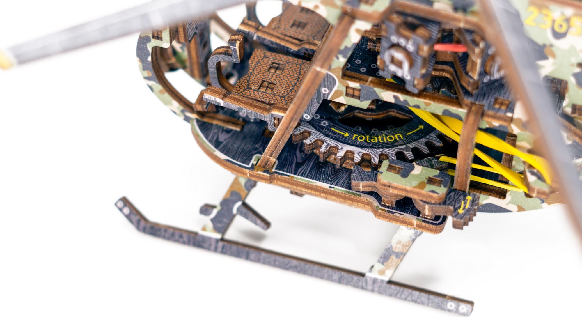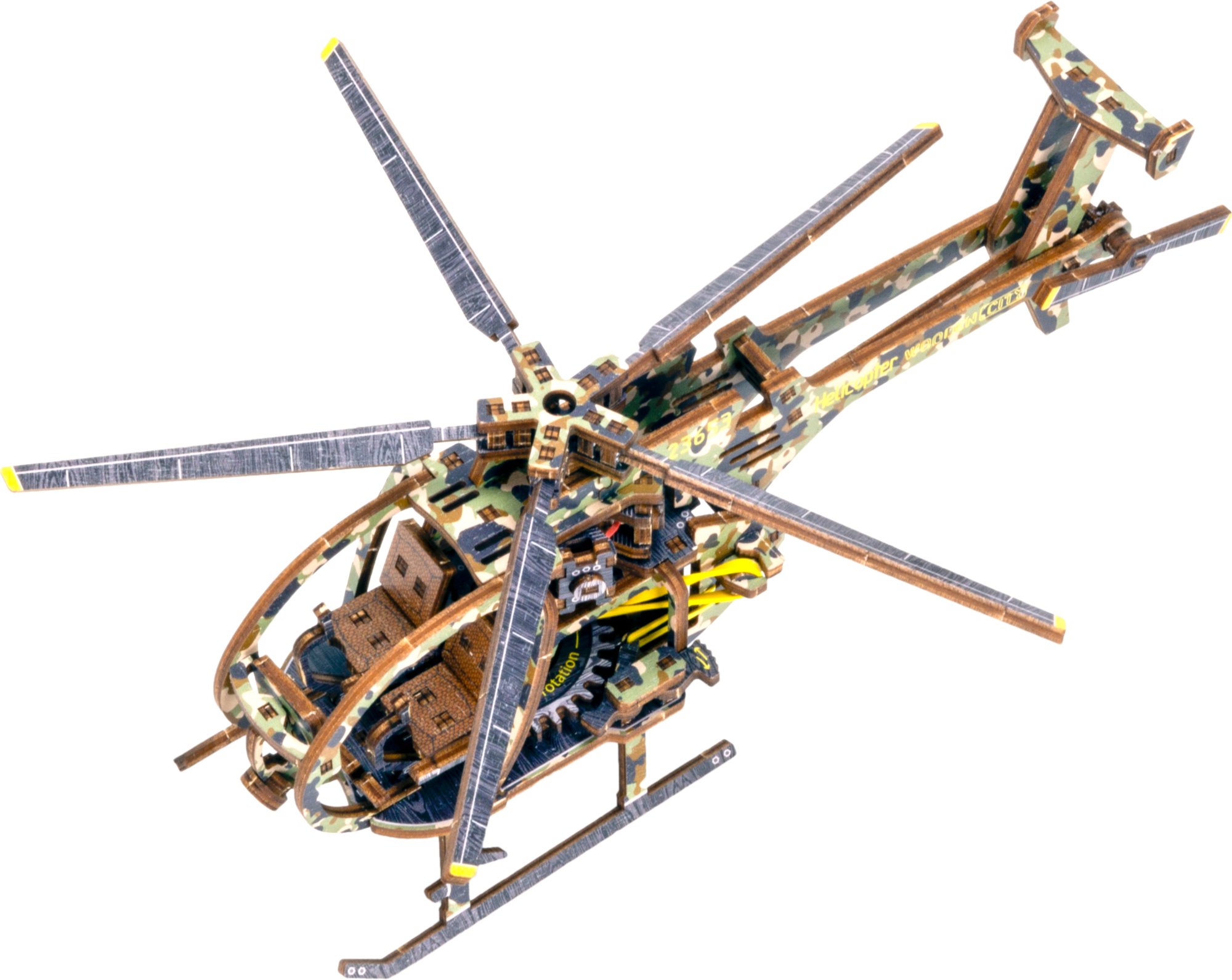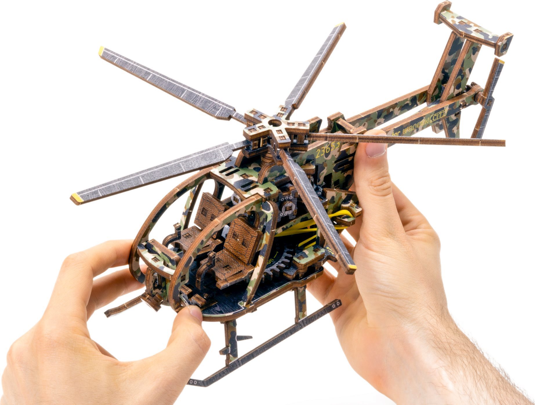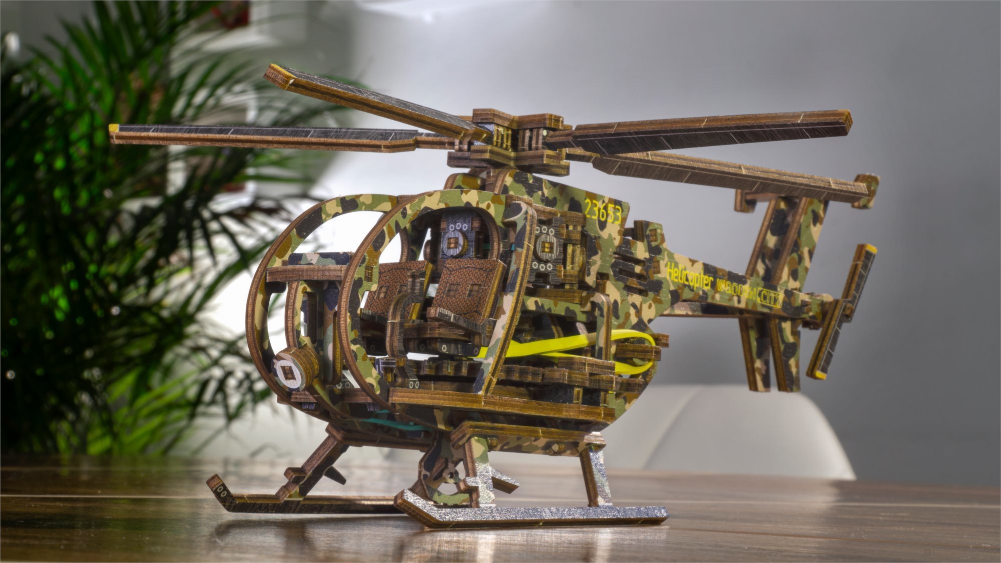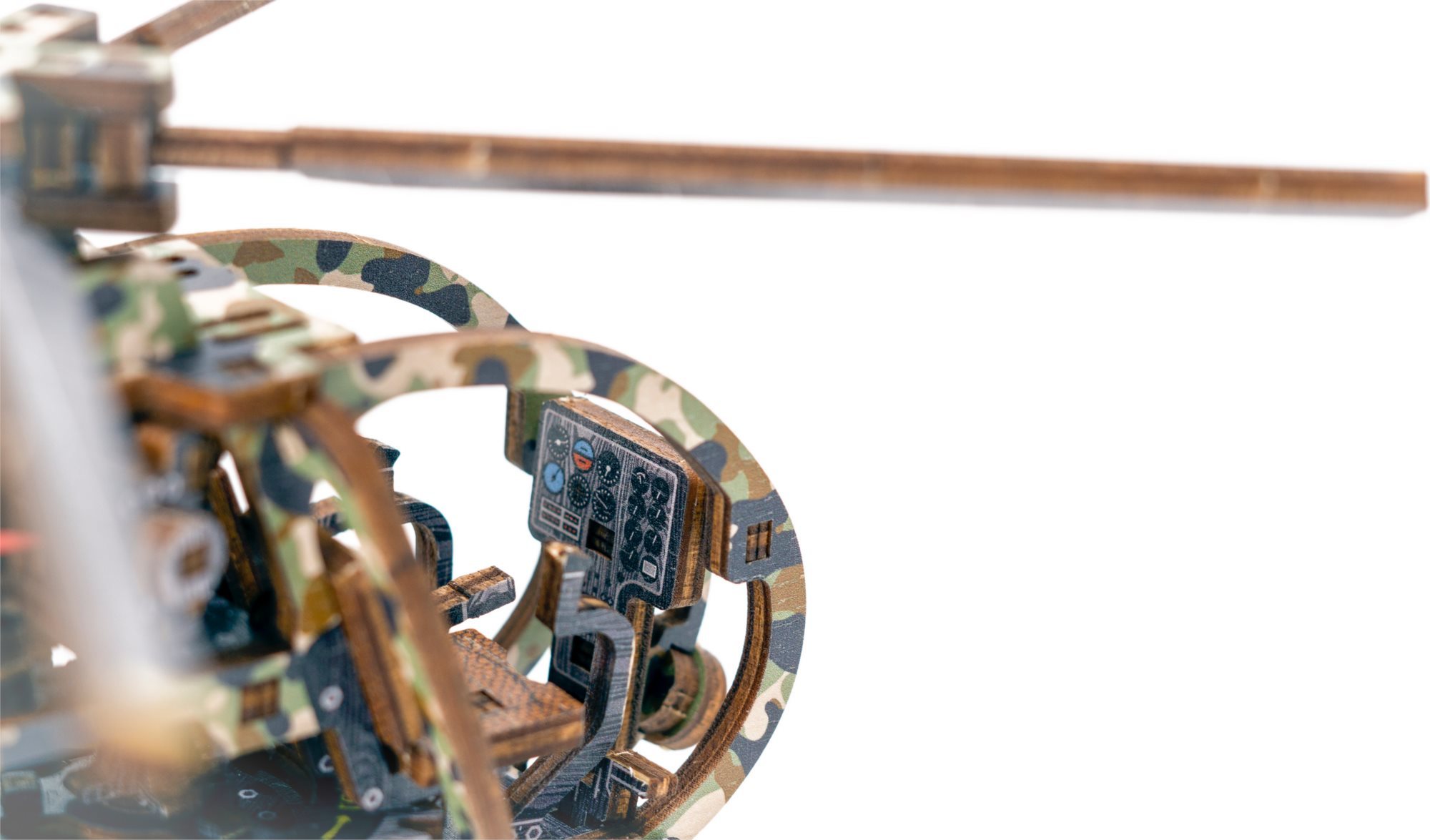 Dřevěná mechanická stavebnice vojenského vrtulníku na vás čeká! Díky jedinečnému designu a překvapivým detailům tohoto modelu bude vaše trávení času plné zábavy a skvělých emocí. Vlastnosti modelu: - výrazné barevné prvky díky vysoce přesnému UV tisku, - dřevěná krabička slouží jako podstavec, - sběratelská edice. 3D puzzle WOODEN CITY Helicopter bude nejlepším dárkem pro každého milovníka letectví. Obtížnost: střední 3 z 5 Orientační doba na složení: 4 hodiny Měřítko: 1:30 Dřevěné 3D puzzle WOODEN CITY jsou detailně propracované funkční mechanické modely, které se skládají bez lepidla nebo nářadí. Jsou vyrobeny z ekologických dřevěných materiálů - kvalitní březové překližky. S mechanickými dřevěnými puzzle WOODEN CITY zažijete hodiny zábavy při skládání a poznáte převody, gumičkové motory, ozubená kolečka a další součástky z bezprostřední blízkosti. funkční mechanický model skládání bez použití lepidla nebo nářadí kvalitní zpracování z přírodního materiálu propracované detaily UPOZORNĚNÍ: K sestavení je třeba ulamovací nůž, nůžky, brusný papír a svíčku z vosku (není součástí výrobku). Pro správné fungování a bezproblémový provoz je potřeba nápravy a ozubená kolečka navoskovat. Rozměr složeného puzzle cca 24 x 12 x 30,5 cmVlastnosti