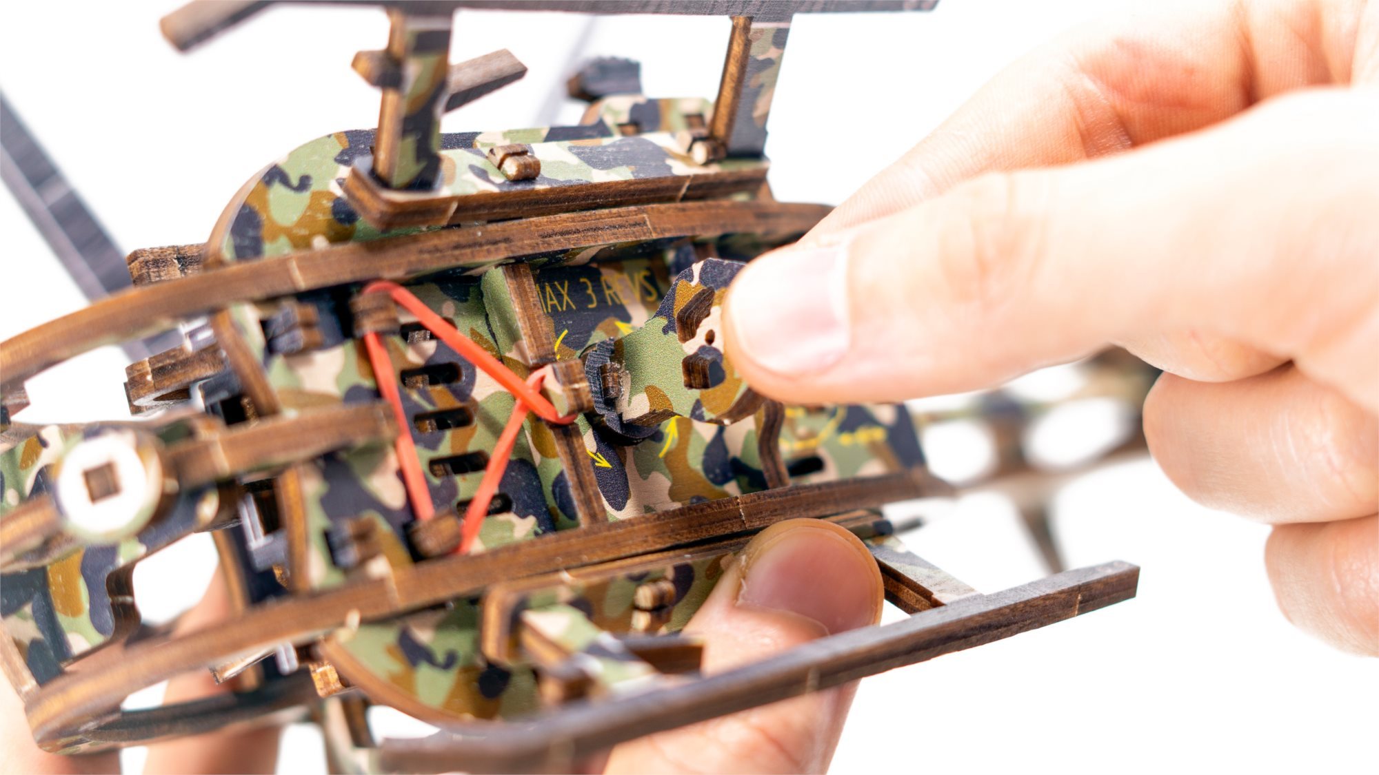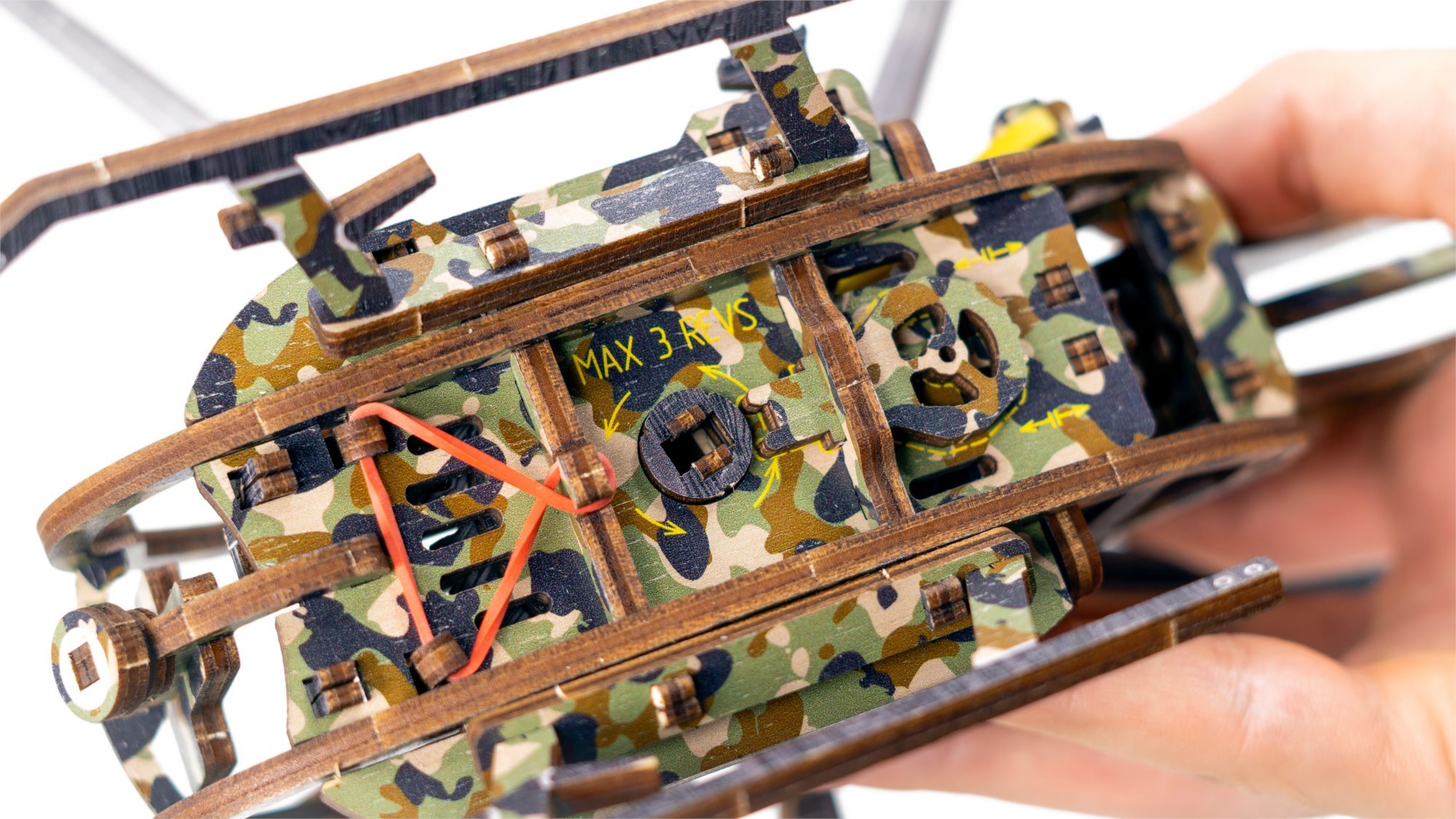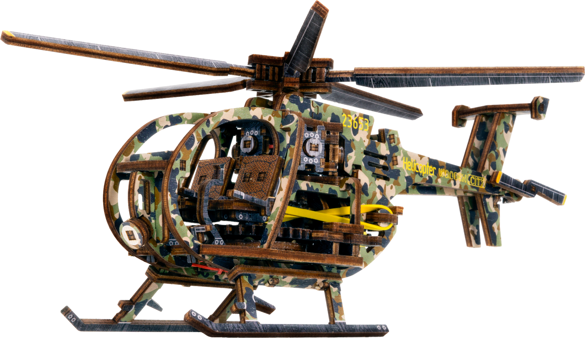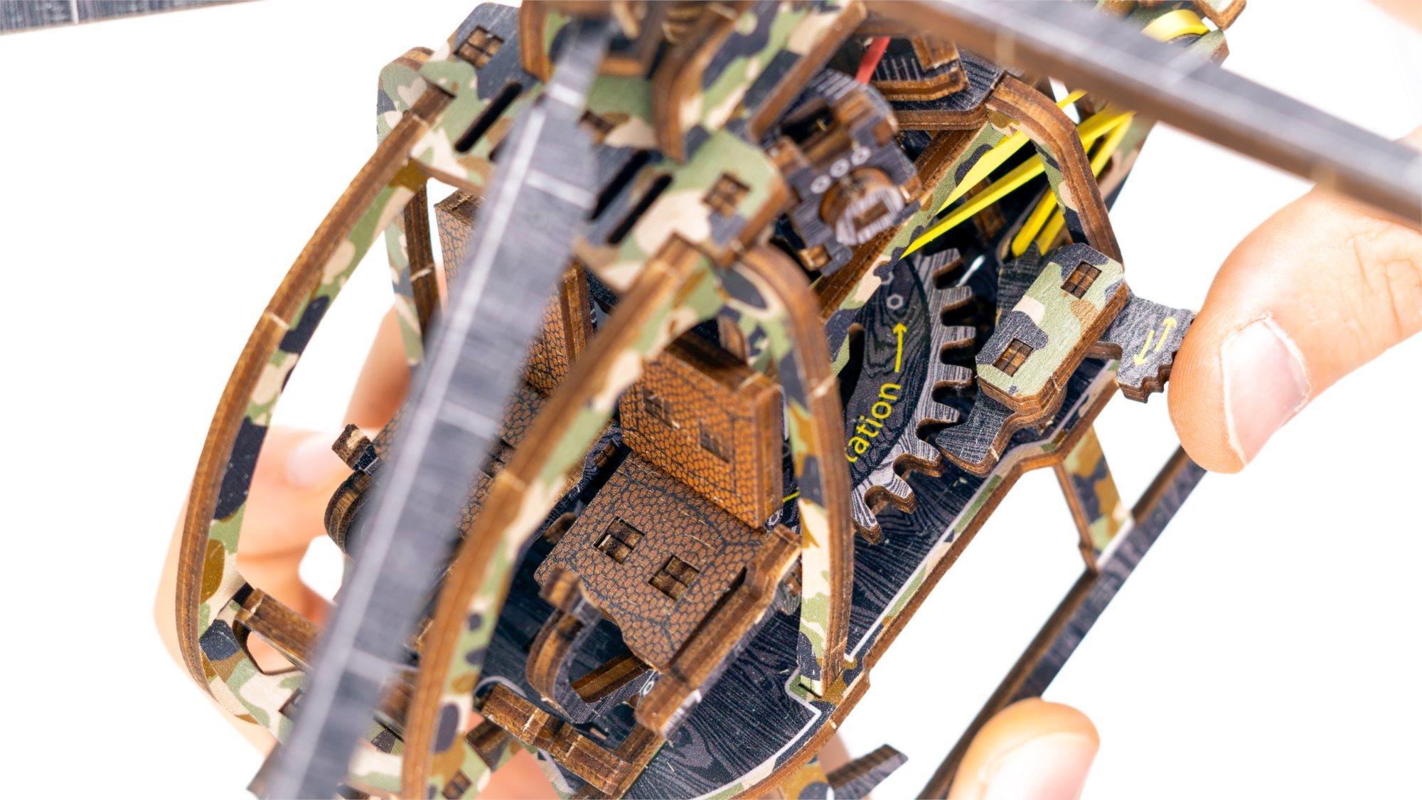 Dřevěná mechanická stavebnice vojenského vrtulníku na vás čeká! Díky jedinečnému designu a překvapivým detailům tohoto modelu bude vaše trávení času plné zábavy a skvělých emocí. Vlastnosti modelu: - výrazné barevné prvky díky vysoce přesnému UV tisku, - dřevěná krabička slouží jako podstavec, - sběratelská edice. 3D puzzle WOODEN CITY Helicopter bude nejlepším dárkem pro každého milovníka letectví. Obtížnost: střední 3 z 5 Orientační doba na složení: 4 hodiny Měřítko: 1:30 Dřevěné 3D puzzle WOODEN CITY jsou detailně propracované funkční mechanické modely, které se skládají bez lepidla nebo nářadí. Jsou vyrobeny z ekologických dřevěných materiálů - kvalitní březové překližky. S mechanickými dřevěnými puzzle WOODEN CITY zažijete hodiny zábavy při skládání a poznáte převody, gumičkové motory, ozubená kolečka a další součástky z bezprostřední blízkosti. funkční mechanický model skládání bez použití lepidla nebo nářadí kvalitní zpracování z přírodního materiálu propracované detaily UPOZORNĚNÍ: K sestavení je třeba ulamovací nůž, nůžky, brusný papír a svíčku z vosku (není součástí výrobku). Pro správné fungování a bezproblémový provoz je potřeba nápravy a ozubená kolečka navoskovat. Rozměr složeného puzzle cca 24 x 12 x 30,5 cmVlastnosti