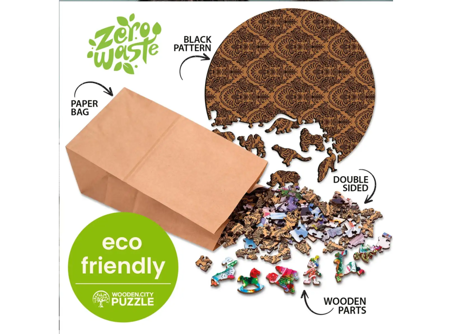 Laserem vyřezávané dřevěné puzzle WOODEN CITY se svými speciálně tvarovanými dílky je neskutečně zábavné. Část dílků je vyrobena ve tvaru zvířat, jejichž výsledný efekt umocňují laserem zvýrazněné detaily. Tyto dílky mohou samostatně stát jako drobné figurky. Skládání puzzle s různotvarými dílky je obtížnější a představuje větší výzvu, než skládání klasického puzzle. Značka WOODEN CITY kromě unikátního konceptu puzzle nezapomíná na ekologii, u těchto výrobku proto nenaleznete žádné plastové obaly. S unikátně tvarovanými dílky ve tvaru zvířat vyšší obtížnost při menším počtu dílků - skládání puzzle s různotvarými dílky je náročnější. Hladké hrany bez třísek díky preciznímu laserovému zpracování, vyrobeno z pevné dřevovláknité HDF desky o síle 3-4mm. Uvnitř balení je samostatná předloha na skládání. EKO Friendly, 100% bez plastových obalů - puzzle je v papírovém sáčku uvnitř papírové krabičky. Vhodný dárek pro jakoukoliv příležitost.