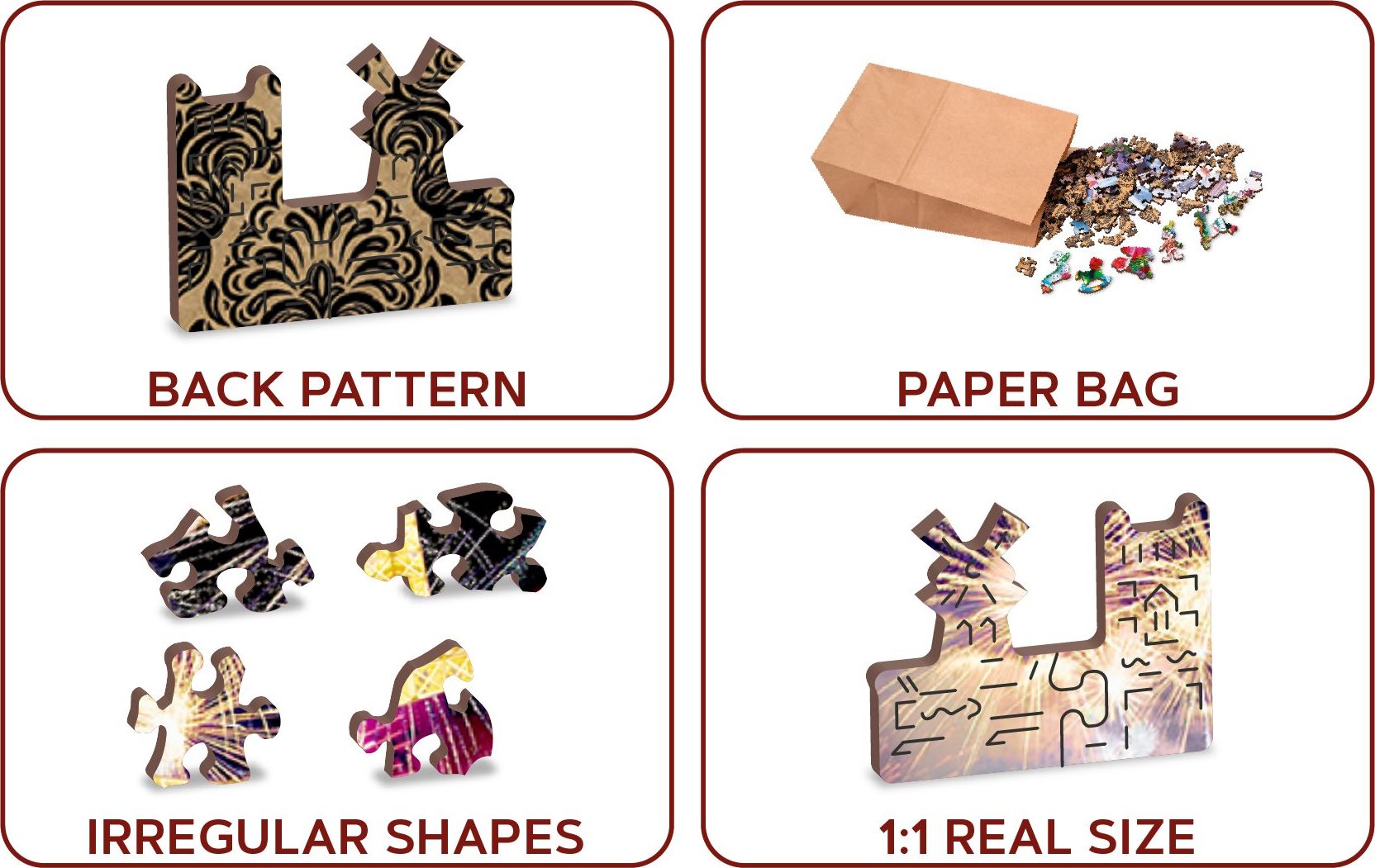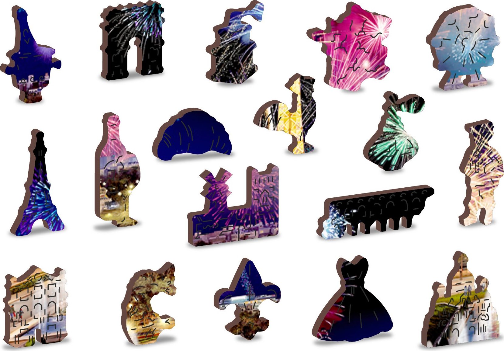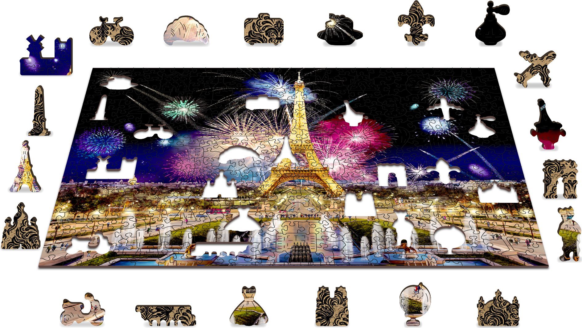 Laserem vyřezávané dřevěné puzzle WOODEN CITY se svými speciálně tvarovanými dílky je neskutečně zábavné. Část dílků je vyrobena ve tvaru zvířat, staveb nebo předmětů , jejichž výsledný efekt umocňují laserem zvýrazněné detaily. Tyto dílky mohou samostatně stát jako drobné figurky. Skládání puzzle s různotvarými dílky je obtížnější a představuje větší výzvu, než skládání klasického puzzle. Puzzle je navíc oboustranné , skládat můžete jak podle obrázku (lícová strana), tak podle tvaru (rubová strana se vzorem). Značka WOODEN CITY kromě unikátního konceptu puzzle nezapomíná na ekologii, u těchto výrobku proto nenaleznete žádné plastové obaly . s unikátně tvarovanými dílky představující známé stavby, předměty nebo zvířata podle tématu motivu vyšší obtížnost při menším počtu dílků - skládání puzzle s různotvarými dílky je náročnější oboustranné puzzle 2v1 - z jedné strany je obrázek, z druhé opakující se vzor pro skládání podle tvaru hladké hrany bez třísek díky preciznímu laserovému zpracování vyrobeno z pevné dřevovláknité HDF desky o síle 3-4mm uvnitř balení je samostatná předloha na skládání EKO Friendly 100% bez plastových obalů - puzzle je v papírovém sáčku uvnitř papírové krabičky vhodný dárek pro jakoukoliv příležitost Velikost: L Počet dílků celkem: 505 Unikátně tvarované dílky: 50 Rozměr složeného puzzle cca 37,5 x 25,4 cmVlastnosti