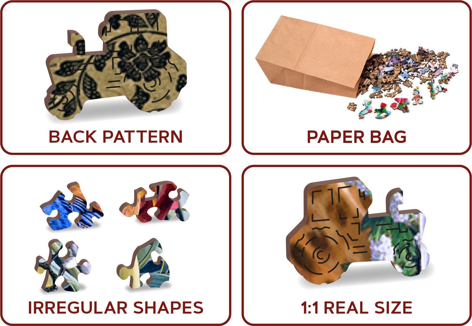 Laserem vyřezávané dřevěné puzzle WOODEN CITY se svými speciálně tvarovanými dílky je neskutečně zábavné. Část dílků je vyrobena ve tvaru zvířat , jejichž výsledný efekt umocňují laserem zvýrazněné detaily. Tyto dílky mohou samostatně stát jako drobné figurky. Skládání puzzle s různotvarými dílky je obtížnější a představuje větší výzvu, než skládání klasického puzzle. Značka WOODEN CITY kromě unikátního konceptu puzzle nezapomíná na ekologii, u těchto výrobku proto nenaleznete žádné plastové obaly . s unikátně tvarovanými dílky ve tvaru zvířat vyšší obtížnost při menším počtu dílků - skládání puzzle s různotvarými dílky je náročnější hladké hrany bez třísek díky preciznímu laserovému zpracování vyrobeno z pevné dřevovláknité HDF desky o síle 3-4mm uvnitř balení je samostatná předloha na skládání EKO Friendly 100% bez plastových obalů - puzzle je v papírovém sáčku uvnitř papírové krabičky vhodný dárek pro jakoukoliv příležitost Velikost: L Počet dílků celkem: 250 Unikátně tvarované dílky: 40 Rozměr složeného puzzle cca 25,4 x 35 cmVlastnosti