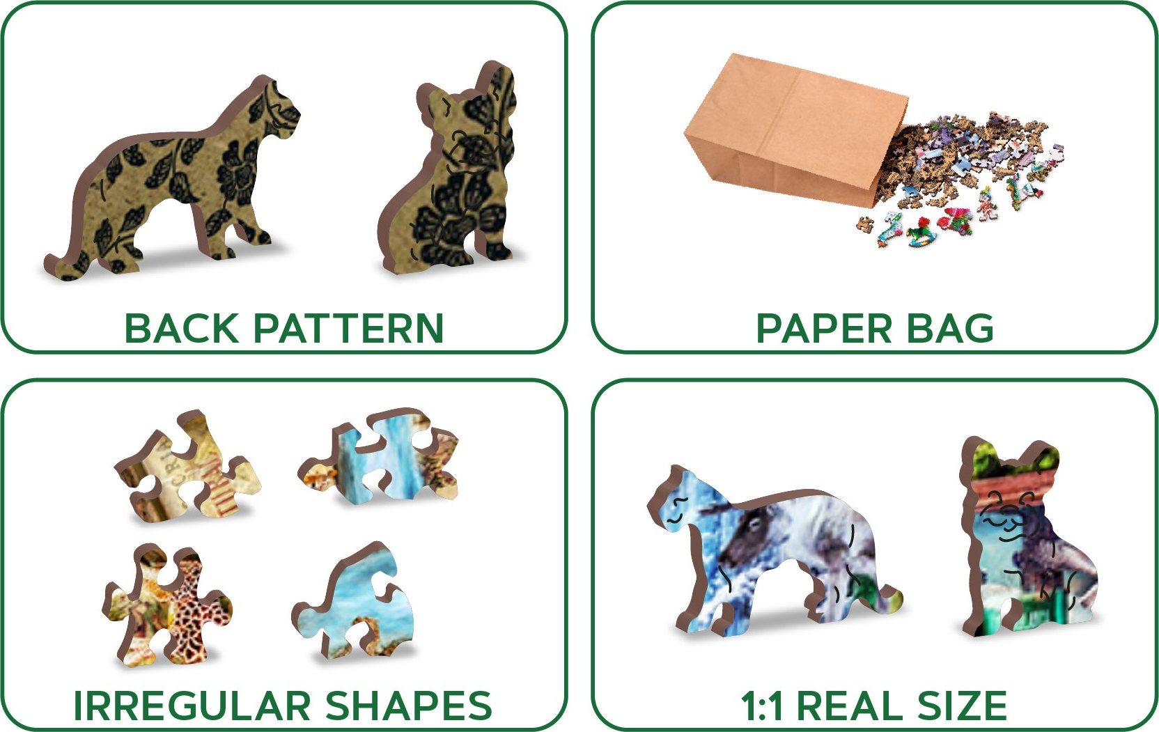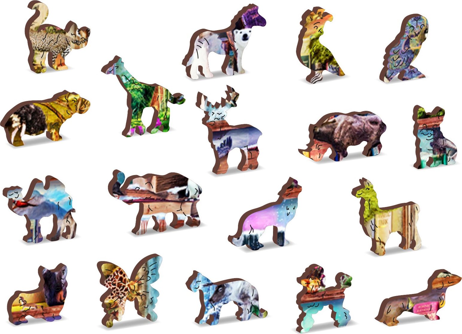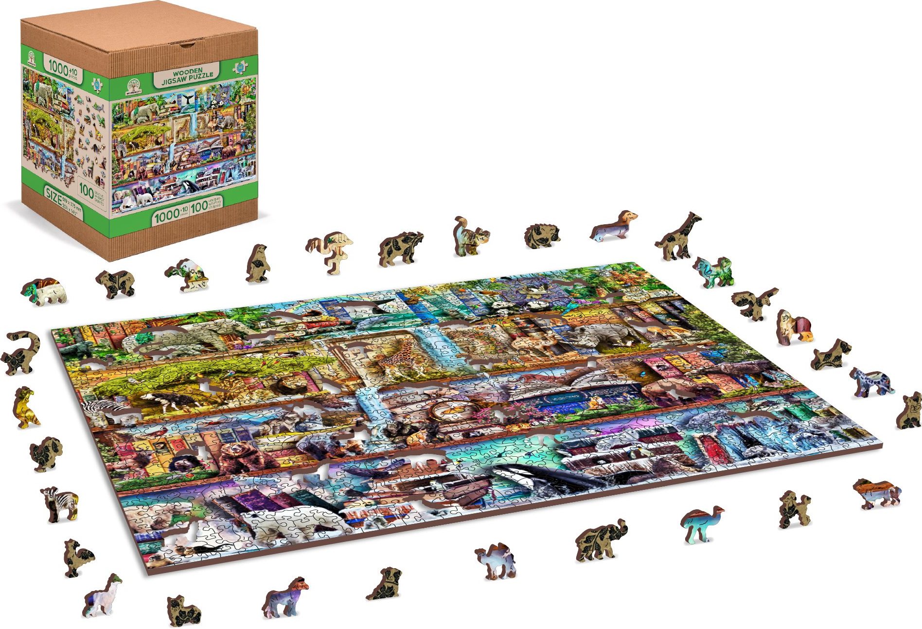 Laserem vyřezávané dřevěné puzzle WOODEN CITY se svými speciálně tvarovanými dílky je neskutečně zábavné. Část dílků je vyrobena ve tvaru zvířat, staveb nebo předmětů , jejichž výsledný efekt umocňují laserem zvýrazněné detaily. Tyto dílky mohou samostatně stát jako drobné figurky. Skládání puzzle s různotvarými dílky je obtížnější a představuje větší výzvu, než skládání klasického puzzle. Puzzle je navíc oboustranné , skládat můžete jak podle obrázku (lícová strana), tak podle tvaru (rubová strana se vzorem). Značka WOODEN CITY kromě unikátního konceptu puzzle nezapomíná na ekologii, u těchto výrobku proto nenaleznete žádné plastové obaly . s unikátně tvarovanými dílky představující známé stavby, předměty nebo zvířata podle tématu motivu vyšší obtížnost při menším počtu dílků - skládání puzzle s různotvarými dílky je náročnější oboustranné puzzle 2v1 - z jedné strany je obrázek, z druhé opakující se vzor pro skládání podle tvaru hladké hrany bez třísek díky preciznímu laserovému zpracování vyrobeno z pevné dřevovláknité HDF desky o síle 3-4mm uvnitř balení je samostatná předloha na skládání EKO Friendly 100% bez plastových obalů - puzzle je v papírovém sáčku uvnitř papírové krabičky vhodný dárek pro jakoukoliv příležitost Velikost: XL Počet dílků celkem: 1010 Unikátně tvarované dílky: 100 Rozměr složeného puzzle cca 51,9 x 37,5 cmVlastnosti