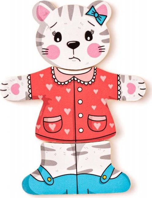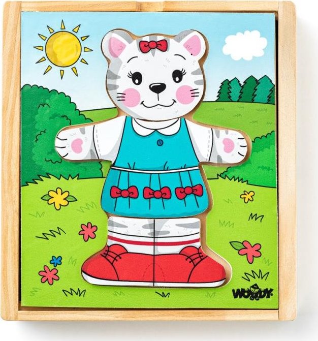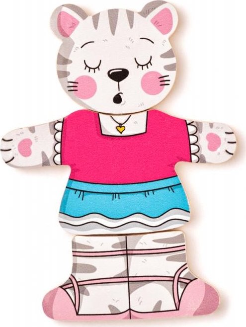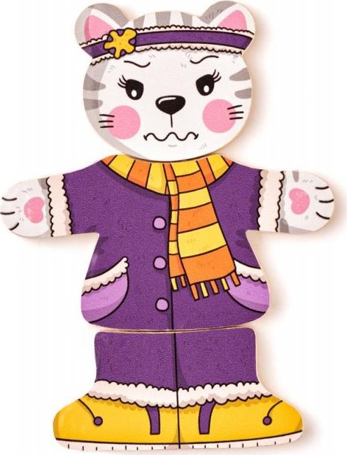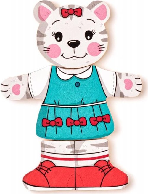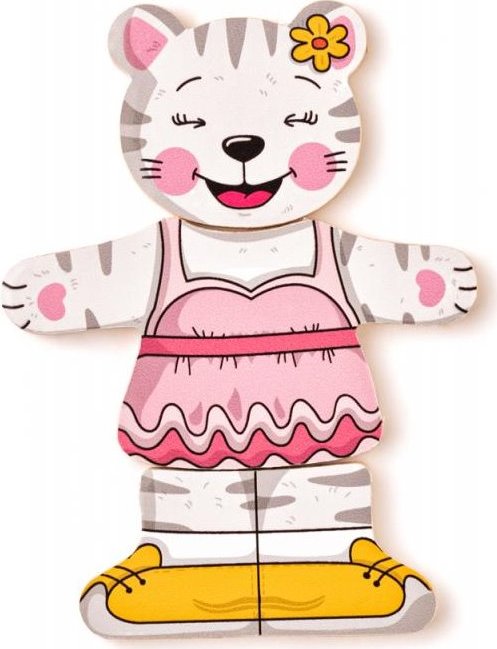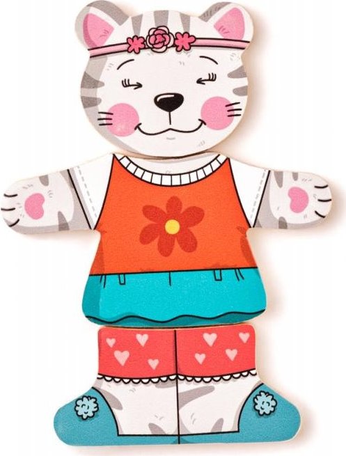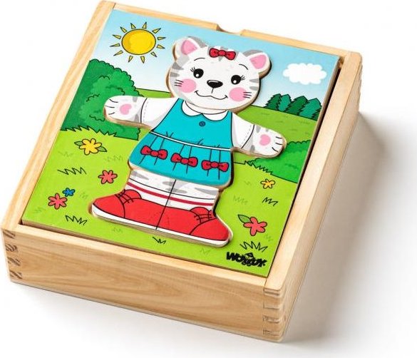 Oblíbená dřevěná "oblékací" skládačka pro malé děti. Děti zde mají možnost si dle vlastní fantazie oblékat a měnit postavičku kočičky. Mají k dispozici obličeje znázorňující různé nálady, tělíčka a nožičky kočky s různými outfity. Baleno v praktické dřevěné krabičce. Rozvijí schopnost logického myšlení a rozvoj fantazie. Obsahuje 18 dílků. Vhodné pro děti od 12 měsíců.Vlastnosti