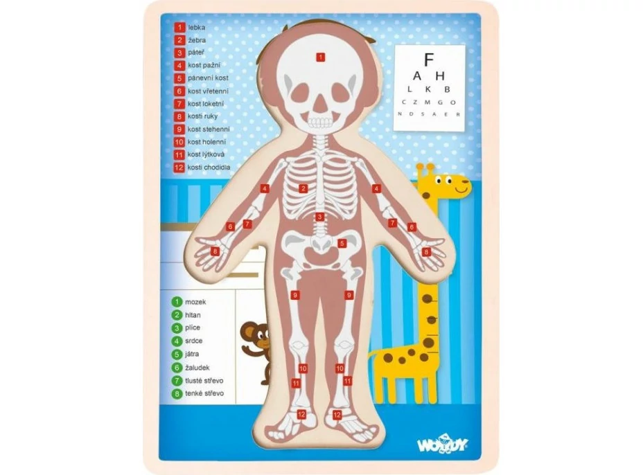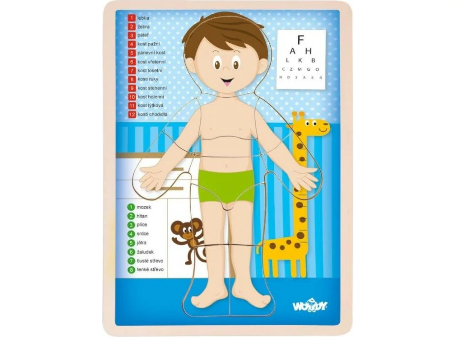 Dřevěné puzzle s motivem lidského těla. Edukativní puzzle, které seznamuje se stavbou lidského těla a lidských orgánů. Dvanáctidílkové puzzle s chlapcem, které má na rubu jednotlivých dílků vyznačeny lidské orgány. Dílky vložíte do podkladového obrázku, kde je zobrazena stavba lidské kostry. Na podkladovém obrázku je také uveden číselný seznam orgánů a lidských kostí. Vhodné pro děti od 3 let.Vlastnosti