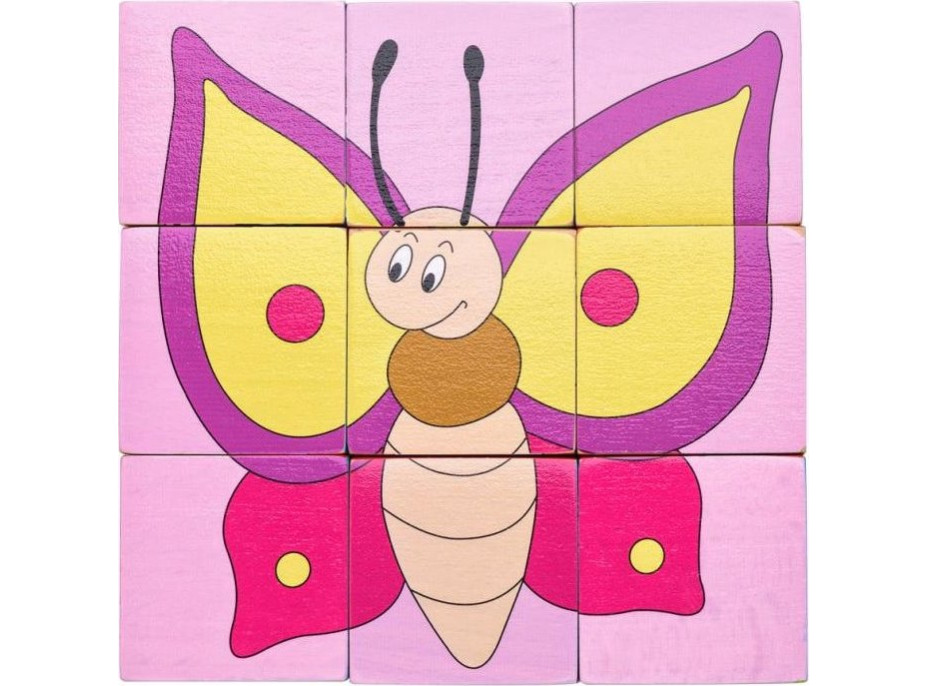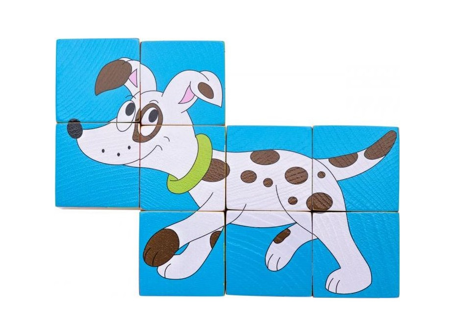 Dřevěné kostky jsou tradiční obrázkovou skládačkou. Tato varianta devíti kostek byla vyvinuta speciálně pro nejmenší děti, kterým při skládání obrázků významně pomůže i jednobarevné pozadí, které je u každého obrázku jiné. Každý z devíti obrázků se zvířátky se skládá do jiného tvaru. Děti tak netvoří klasický obraz 3x3, ale pokaždé jiný tvar, na kterém najdou pokaždé jiné zvířátko. Kostky jsou uloženy v dřevěné krabičce.