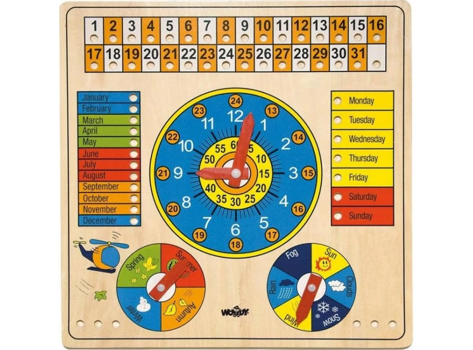 Víceúčelový kalendář v angličtině je edukativní hračka, která děti seznámí hned s několika potřebnými věcmi. Děti se seznámí: - s jednotlivými dny v měsíci - s jednotlivými dny v týdnu - s hodinami - s ročním obdobím - s počasím - s dvanácti měsíci v roce Hodinové ručičky, stejně jako ukazatel počasí a ročního období, jsou pohyblivé. Součástí balení jsou i dvě zarážky (stojánky) a 6 malých kuliček. Vhodné pro děti od 5 let.Vlastnosti