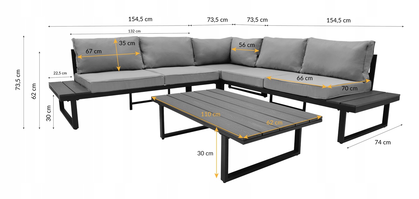 - rohové křeslo: 73,5 x 73,5 x 62 cm