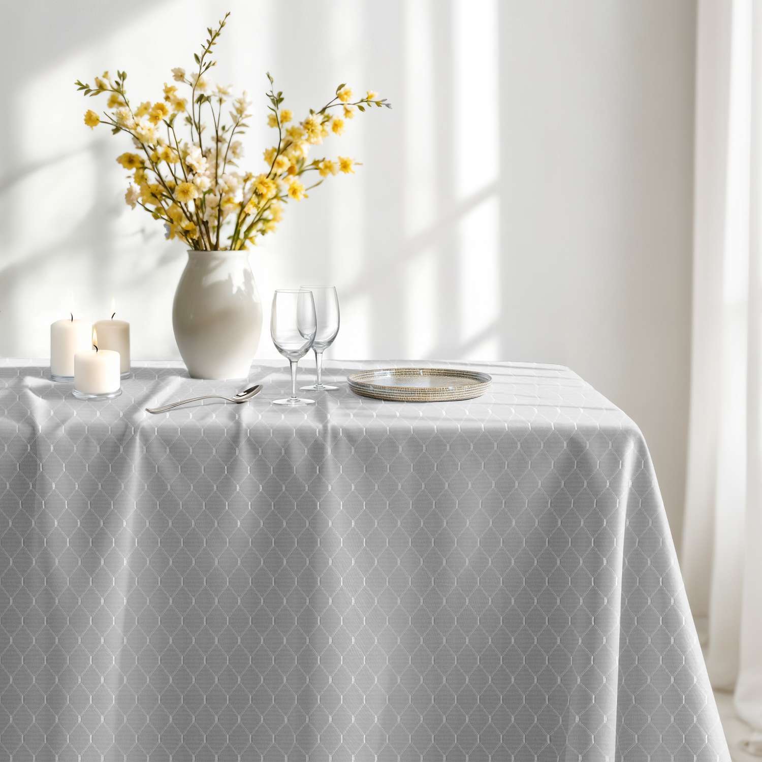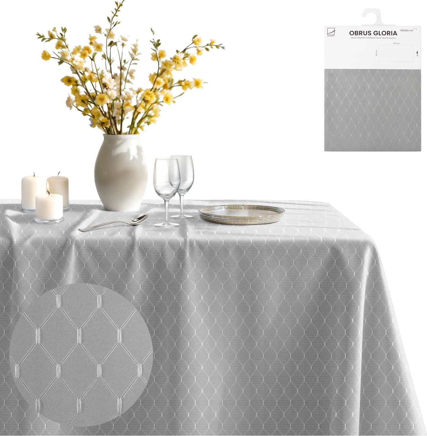 Kolekce GLORIA je dokonalou směsicí klasiky a moderny a dodává každému interiéru jemný dekorativní nádech. Ubrusy jsou vyrobeny z elegantní žakárové látky, mají jednotný, jemný vzor a jsou k dispozici ve dvou univerzálních barvách: bílé a šedé. Díky tlumeným barvám doplňují ubrusy a běhouny GLORIA tradiční i moderní dekor a dodávají každé místnosti sofistikovaný nádech.