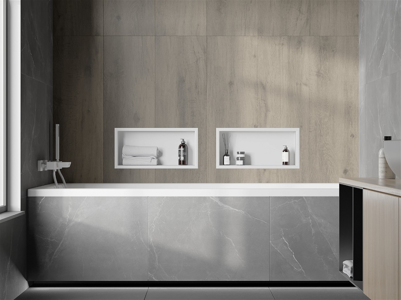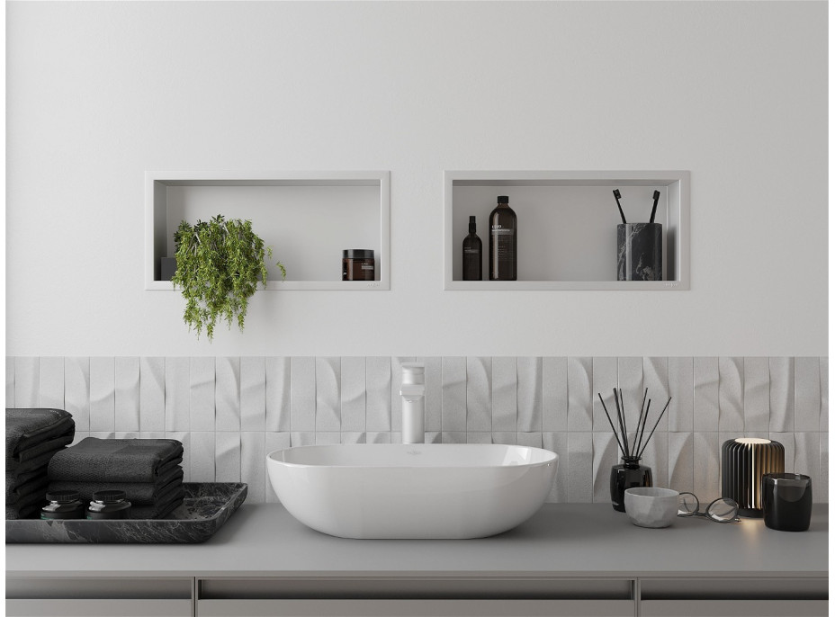 Podomítková police vyrobená z nerezové oceli s bílou povrchovou úpravou nabídne jednoduché řešení pro uskladnění kosmetických potřeb, které zabere minimum místa v prostoru. Polici totiž snadno zabudujete přímo do zdi. Díky použitým materiálům tedy velice dobře odolává vlhkosti.