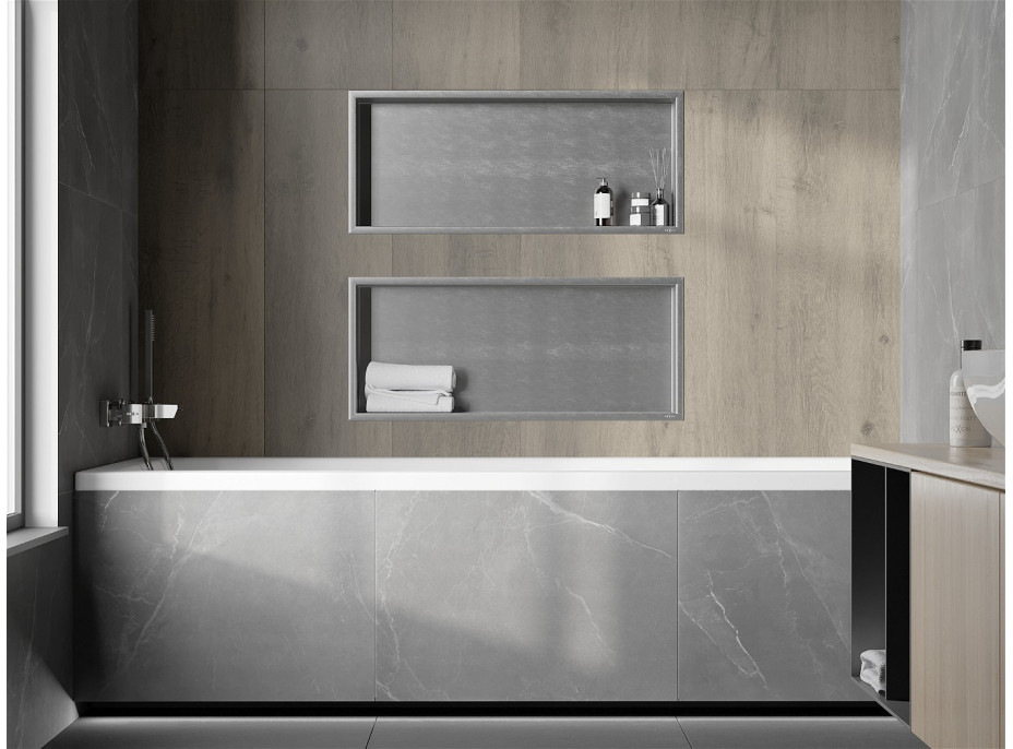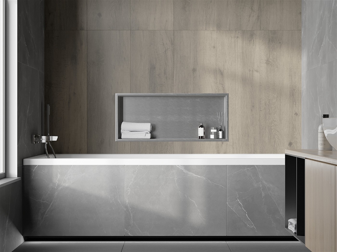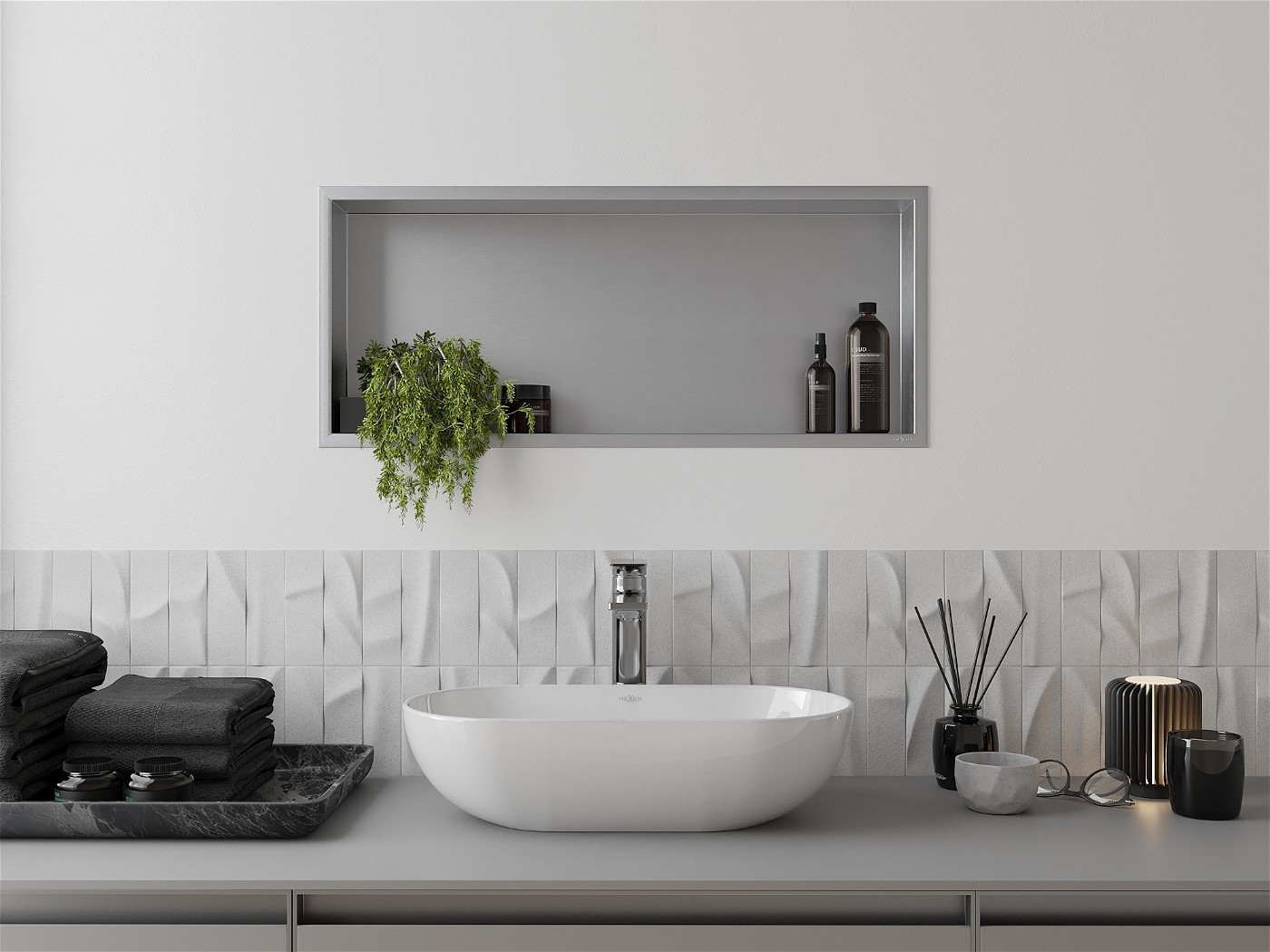 Podomítková police vyrobená z nerezové oceli s chromovou broušenou (INOX) povrchovou úpravou nabídne jednoduché řešení pro uskladnění kosmetických potřeb, které zabere minimum místa v prostoru. Polici totiž snadno zabudujete přímo do zdi. Díky použitým materiálům tedy velice dobře odolává vlhkosti.