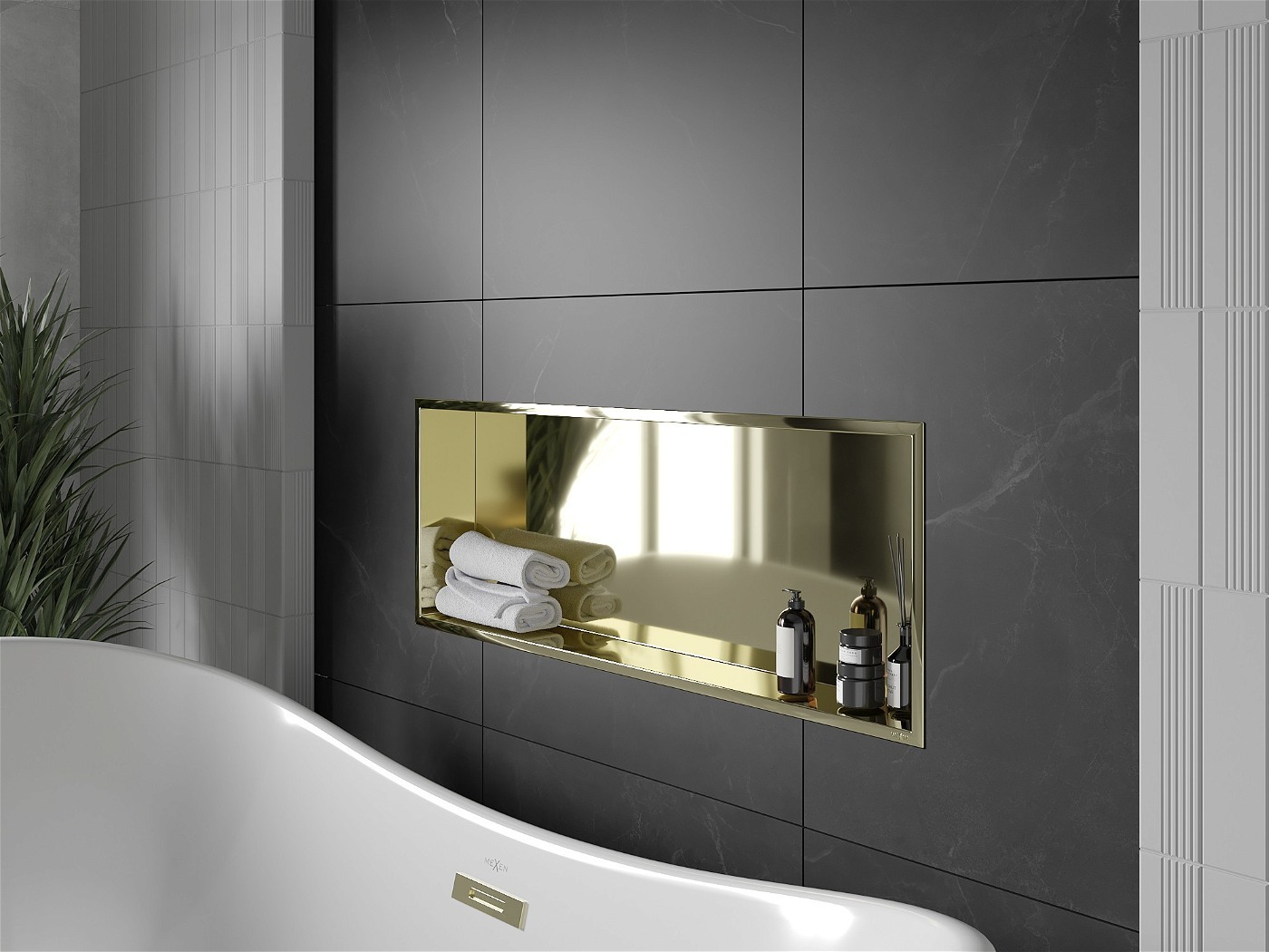 Podomítková police vyrobená z nerezové oceli se zlatou lesklou povrchovou úpravou nabídne jednoduché řešení pro uskladnění kosmetických potřeb, které zabere minimum místa v prostoru. Polici totiž snadno zabudujete přímo do zdi. Díky použitým materiálům tedy velice dobře odolává vlhkosti.