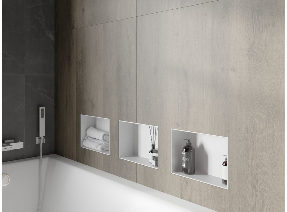 Podomítková police vyrobená z nerezové oceli s bílou povrchovou úpravou nabídne jednoduché řešení pro uskladnění kosmetických potřeb, které zabere minimum místa v prostoru. Polici totiž snadno zabudujete přímo do zdi a díky podomítkovému límci ji obložíte kachličkami nebo omítkou. Díky použitým materiálům tedy velice dobře odolává vlhkosti.