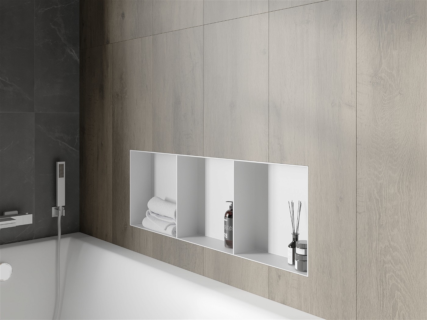 Podomítková police vyrobená z nerezové oceli s bílou povrchovou úpravou nabídne jednoduché řešení pro uskladnění kosmetických potřeb, které zabere minimum místa v prostoru. Polici totiž snadno zabudujete přímo do zdi a díky podomítkovému límci ji obložíte kachličkami nebo omítkou. Díky použitým materiálům tedy velice dobře odolává vlhkosti.