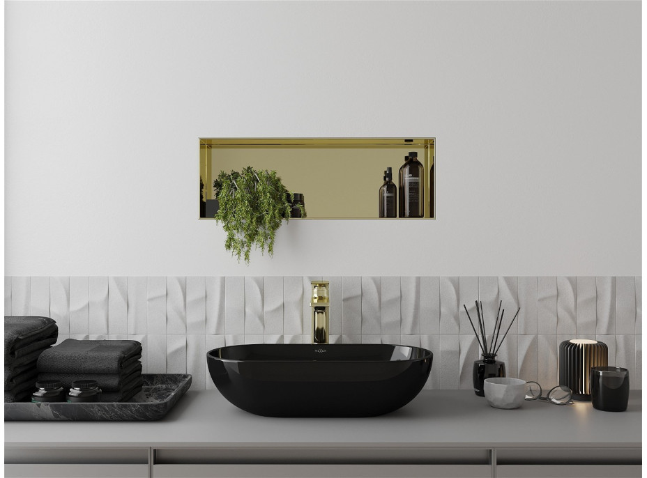 Podomítková police vyrobená z nerezové oceli se zlatou lesklou povrchovou úpravou nabídne jednoduché řešení pro uskladnění kosmetických potřeb, které zabere minimum místa v prostoru. Polici totiž snadno zabudujete přímo do zdi a díky podomítkovému límci ji obložíte kachličkami nebo omítkou. Díky použitým materiálům tedy velice dobře odolává vlhkosti.