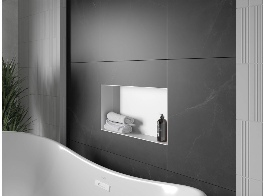 Podomítková police vyrobená z nerezové oceli s bílou povrchovou úpravou nabídne jednoduché řešení pro uskladnění kosmetických potřeb, které zabere minimum místa v prostoru. Polici totiž snadno zabudujete přímo do zdi a díky podomítkovému límci ji obložíte kachličkami nebo omítkou. Díky použitým materiálům tedy velice dobře odolává vlhkosti.