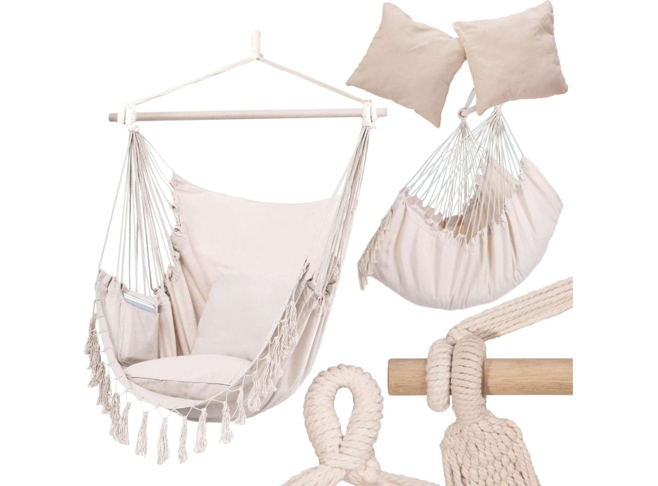 Bahio je pohodlné závěsné křeslo, díky kterému bude váš odpočinek mimořádně pohodlný a příjemný. Ideální pro odpočinek u kávy nebo zajímavé knihy. Model je vyroben z polybavlny, takže se dokonale přizpůsobí tvaru těla. Plné pohodlí zajistí dva polštáře, které jsou součástí sady. Houpací síť lze instalovat jak uvnitř, tak venku. Ideální na zahradu a terasu. Závěsné křeslo Bahio je bezpečné pro vás a vaši rodinu. Při výrobě bylo použito pouze dřevo a polybavlna. Houpací křeslo je pečlivě vyrobeno, má pevné výplety a odolný dřevěný rám. Atraktivní design ve stylu boho se bude skvěle hodit na každou zahradu či terasu i do moderních zařízení bytu. Křeslo je dodáváno s praktickým obalem, který umožňuje snadné skladování a přenášení.