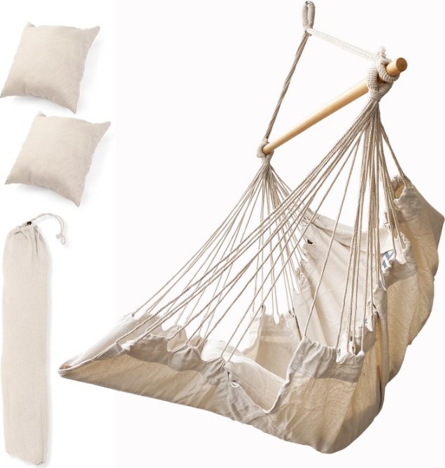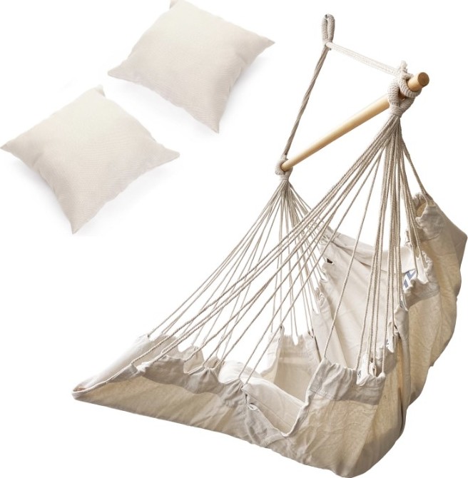 Relaxace na křesle s opěrkou nohou je skvělý způsob, jak dosáhnout pohody doma. Jemné houpání a pocit zabalení regeneruje tělo i mysl a přináší klid a rovnováhu. Závěsné houpací křeslo do domu nebo na zahradu osloví milovníky boho stylu. Pevná plátěná základna a robustní lana umožňují pevné a pohodlné houpání. Toto brazilské křeslo má velkou všitou kapsu, do které se vejde kniha nebo tablet. Součástí dodávky je také polštář. Toto pohodlné a neuvěřitelně příjemné závěsné houpací křeslo vám poskytne prostor k relaxaci a odpočinku. Na boku má další látkovou vložku, která slouží jako opěrka nohou. To vám umožní houpat se vleže i vsedě.