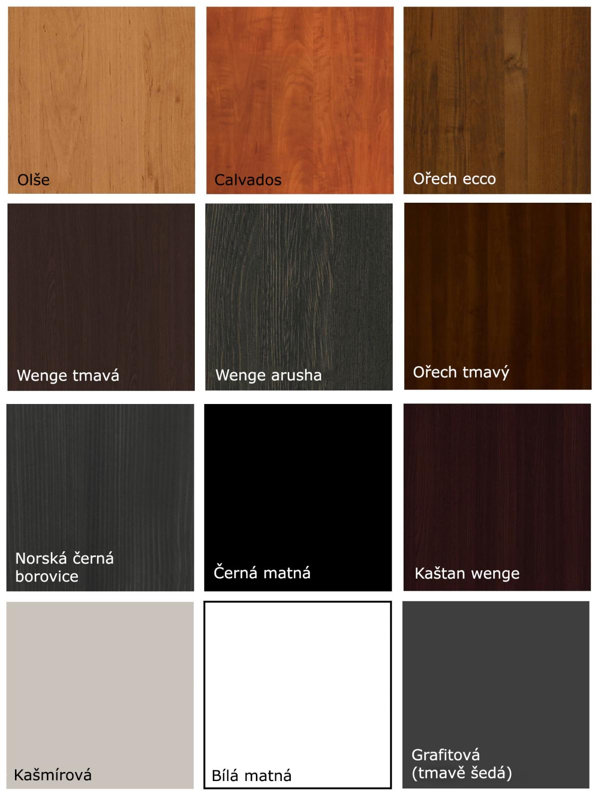 Vybrat si můžete ze spousty dekorů, abyste dokonale sladili stolek s obývacím pokojem. Na výběr máte z tmavého wenge, ořechu wenge, arusha wenge, ořechu ecco, dubu landino, tmavého ořechu, dubu sonoma, jasanu coimbra, dubu sonoma tabákového, calvados, švestky, olše, černé matné barvy, norské borovice černé nebo bílé, dubu san remo nebo velmi oblíbeného dubu craft zlatého, který naleznete i na fotografiích produktu.