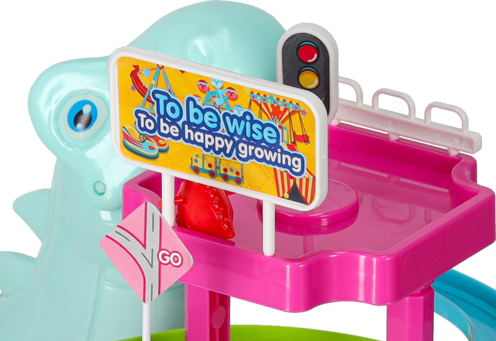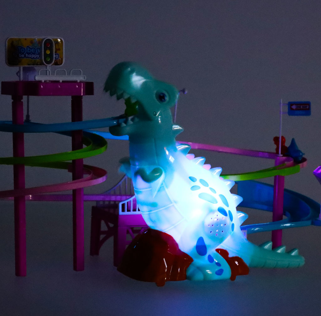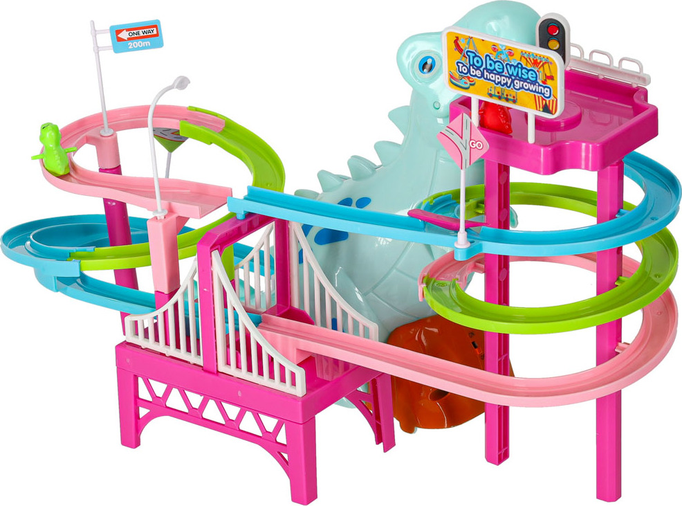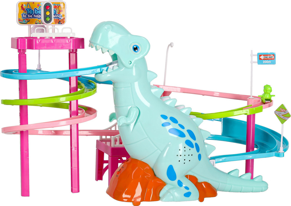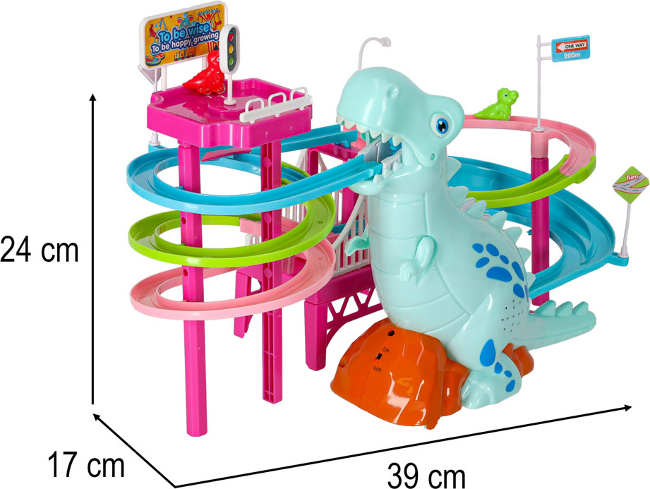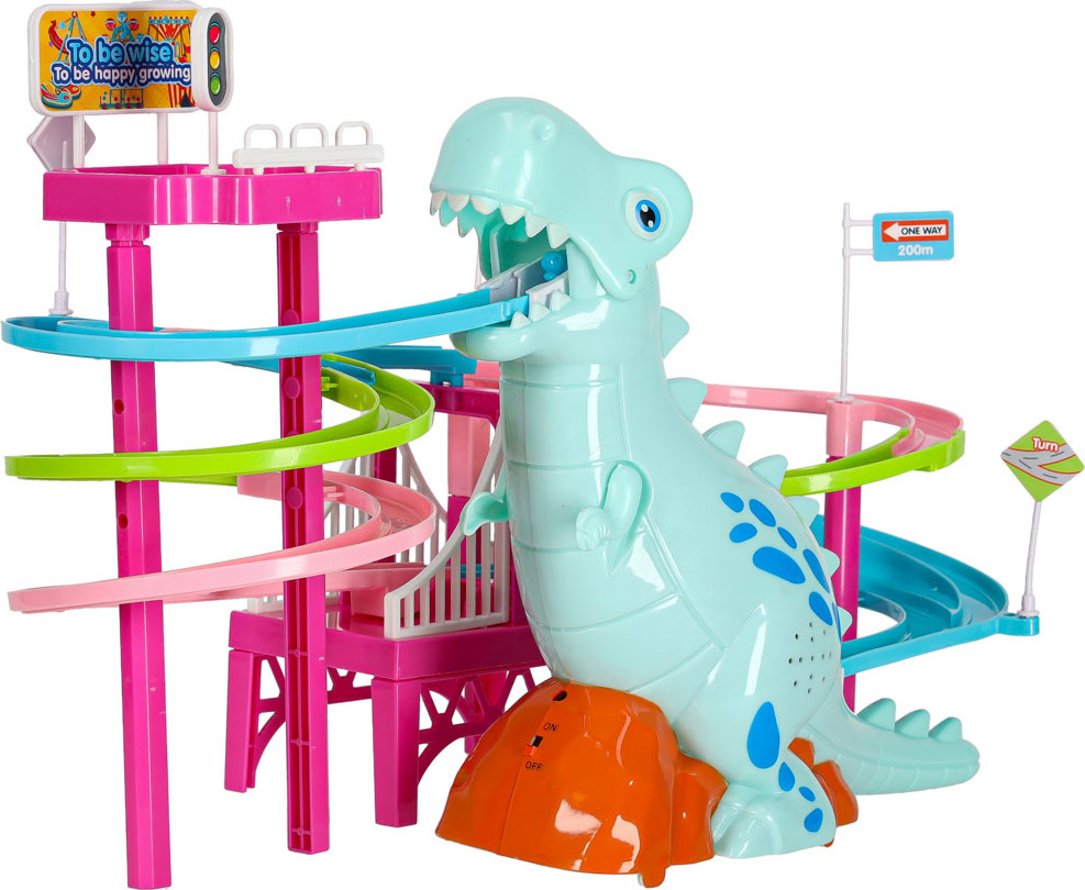 Je to hračka, která vydává zvuky. Auta mají vlastní pohon, takže mohou jezdit nahoru a dolů po klikaté dráze. Když autíčka jedou, velký dinosaurus vydává houkavý zvuk.