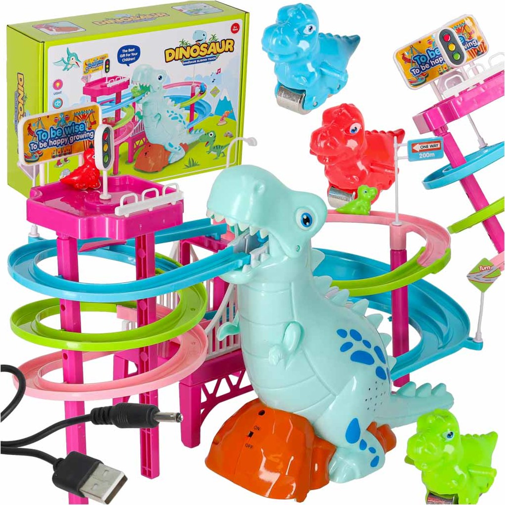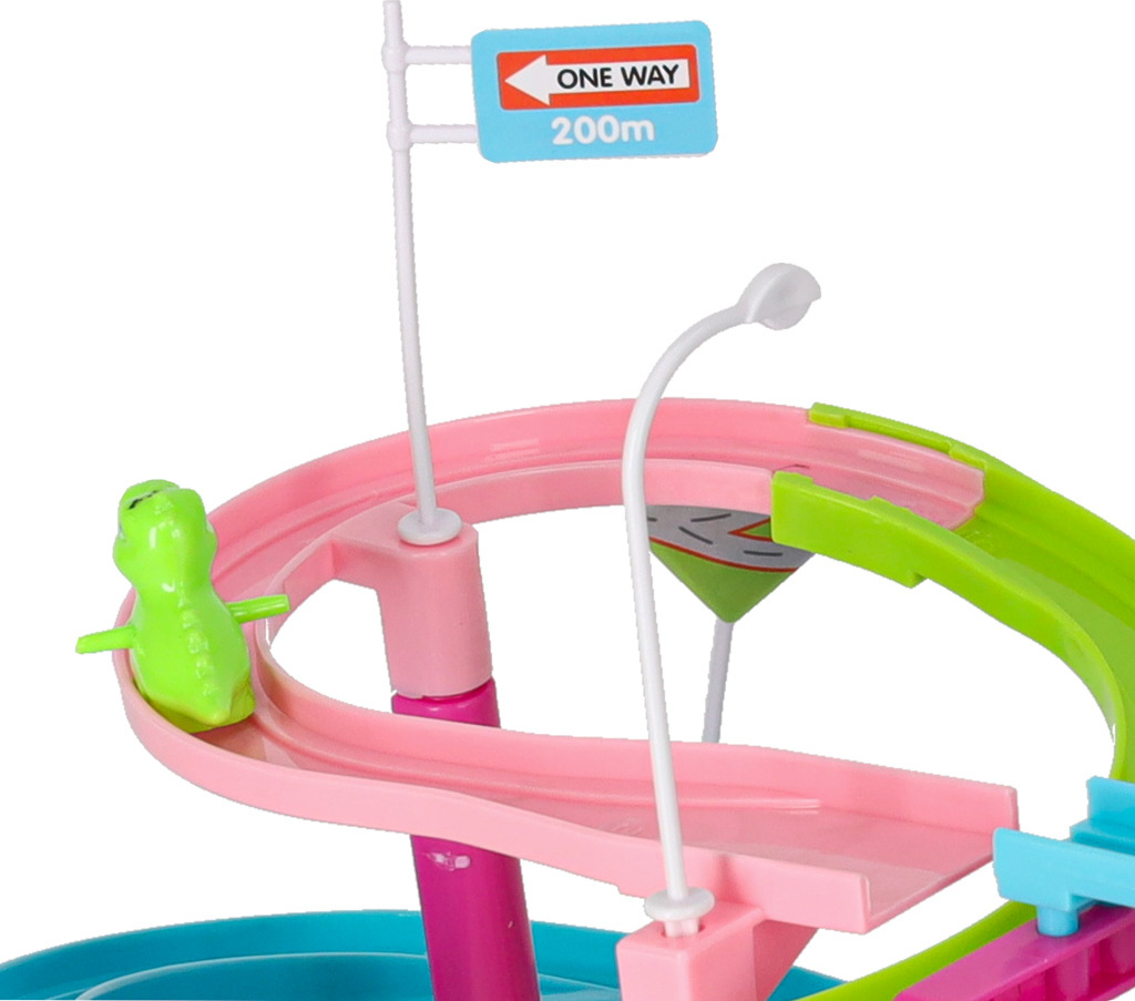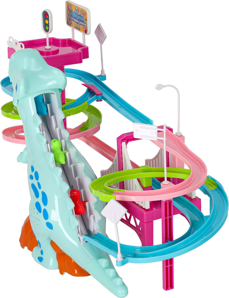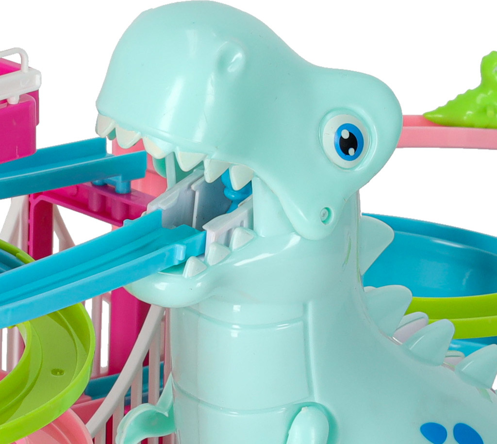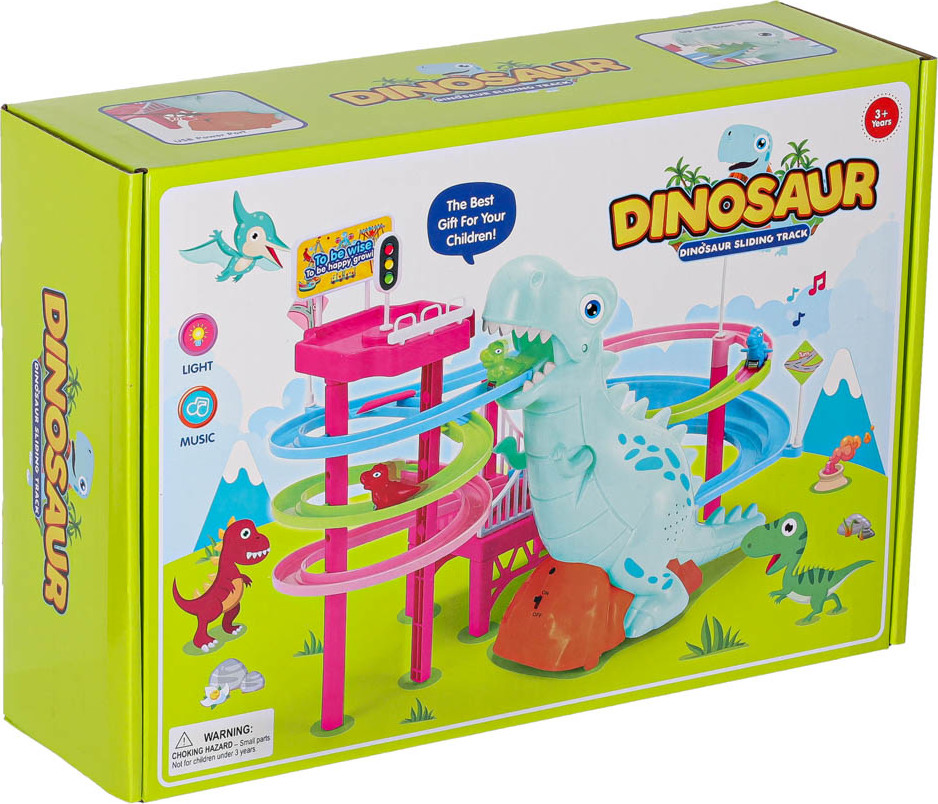 Je to hračka, která vydává zvuky. Auta mají vlastní pohon, takže mohou jezdit nahoru a dolů po klikaté dráze. Když autíčka jedou, velký dinosaurus vydává houkavý zvuk.